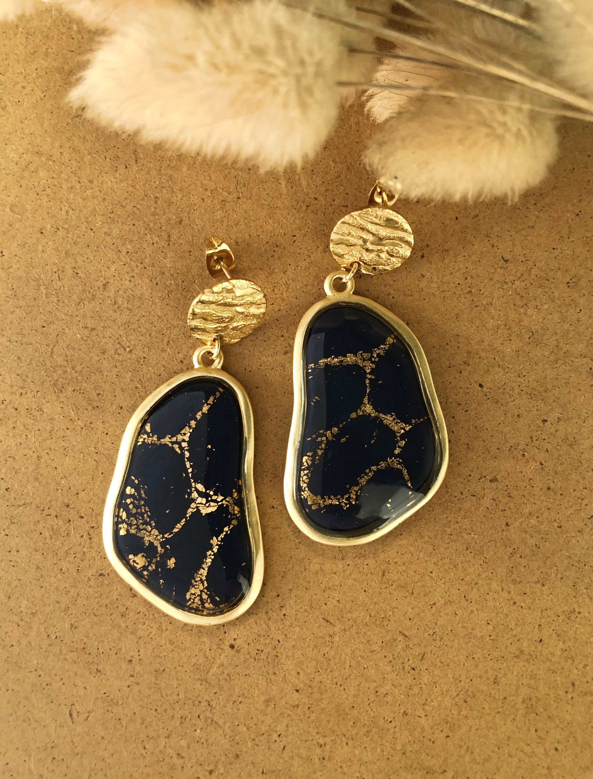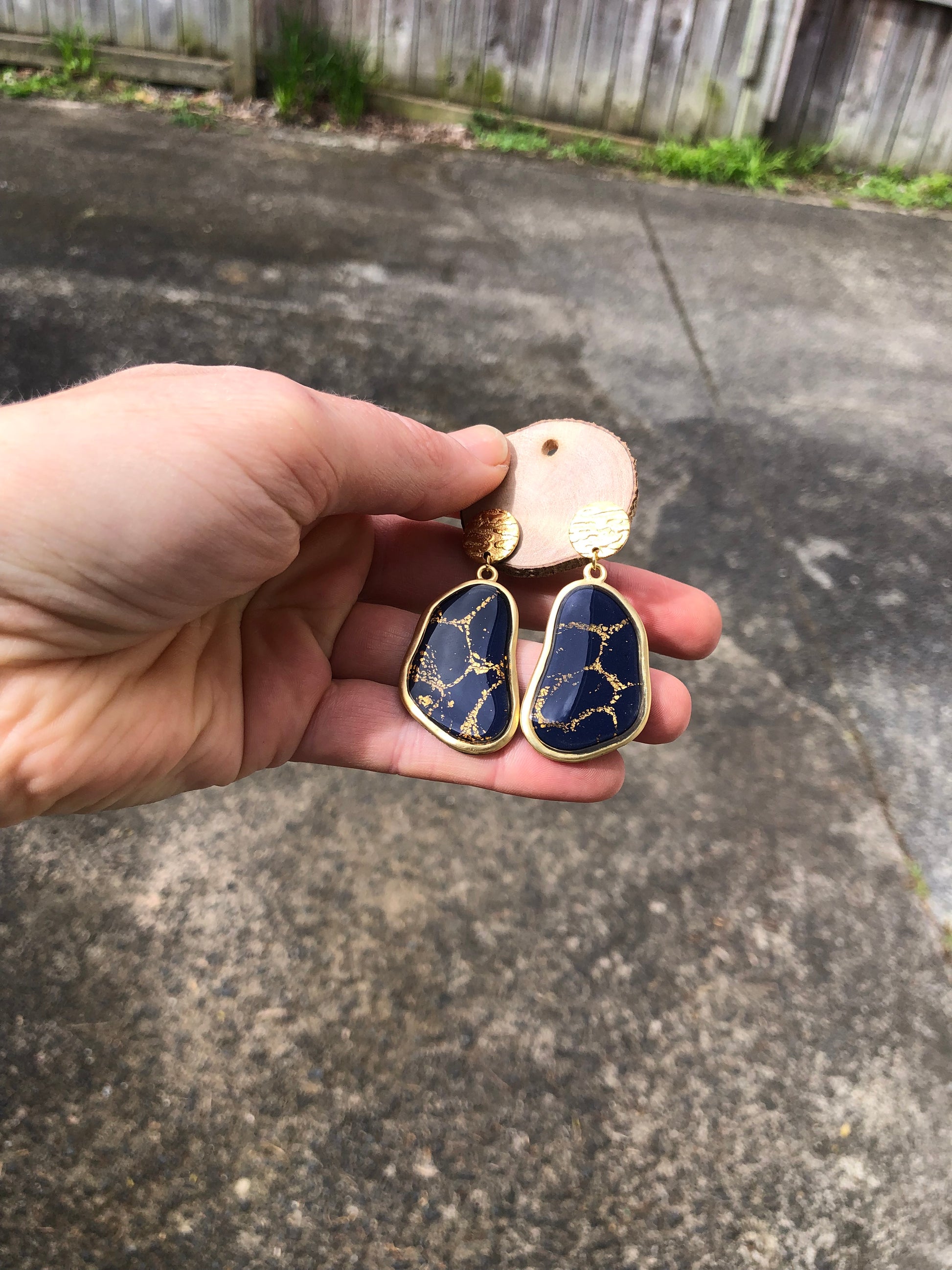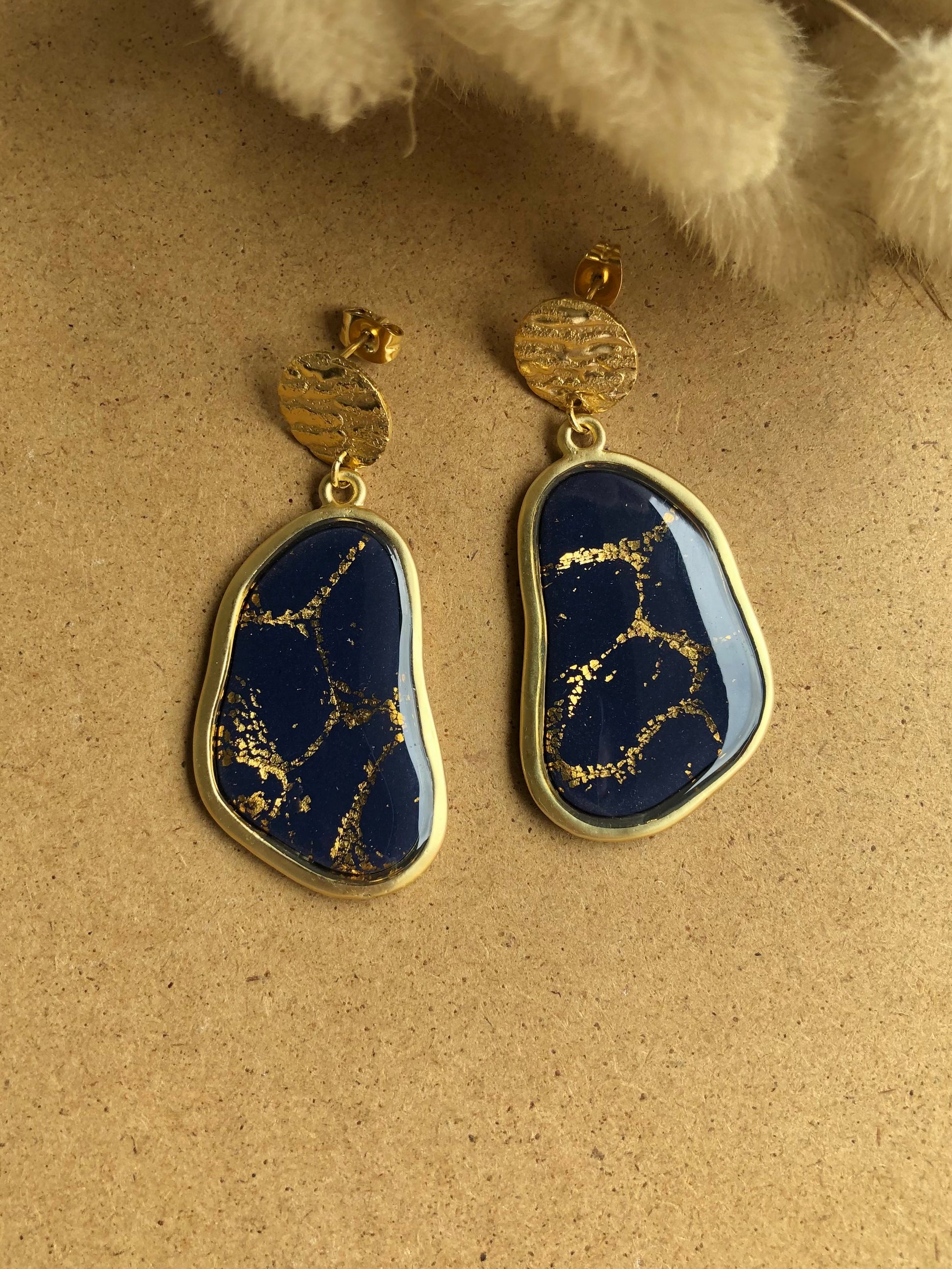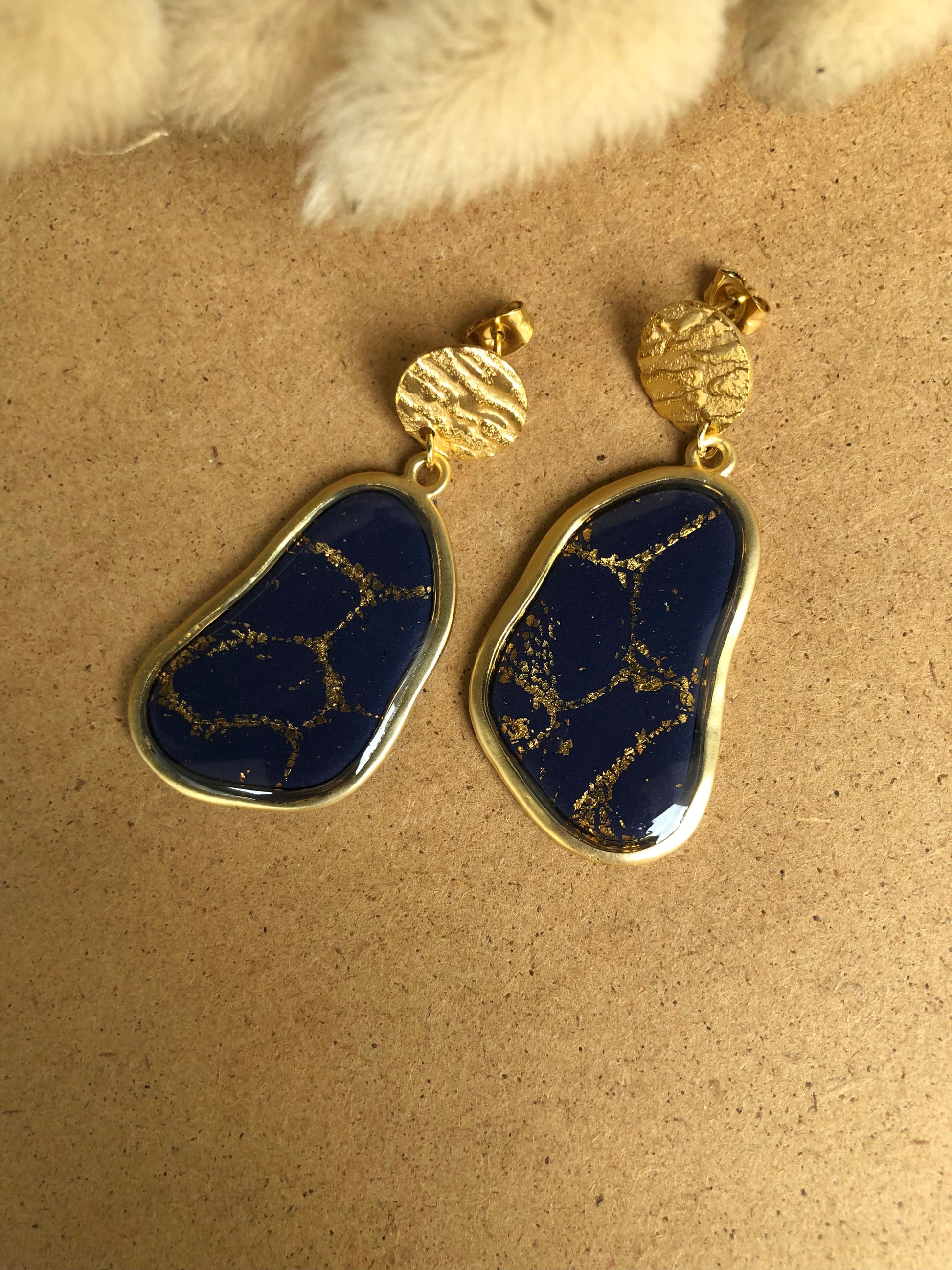 Gorgeous dark blue and golden leaf earrings. Medium size. It’s a statement jewelry!