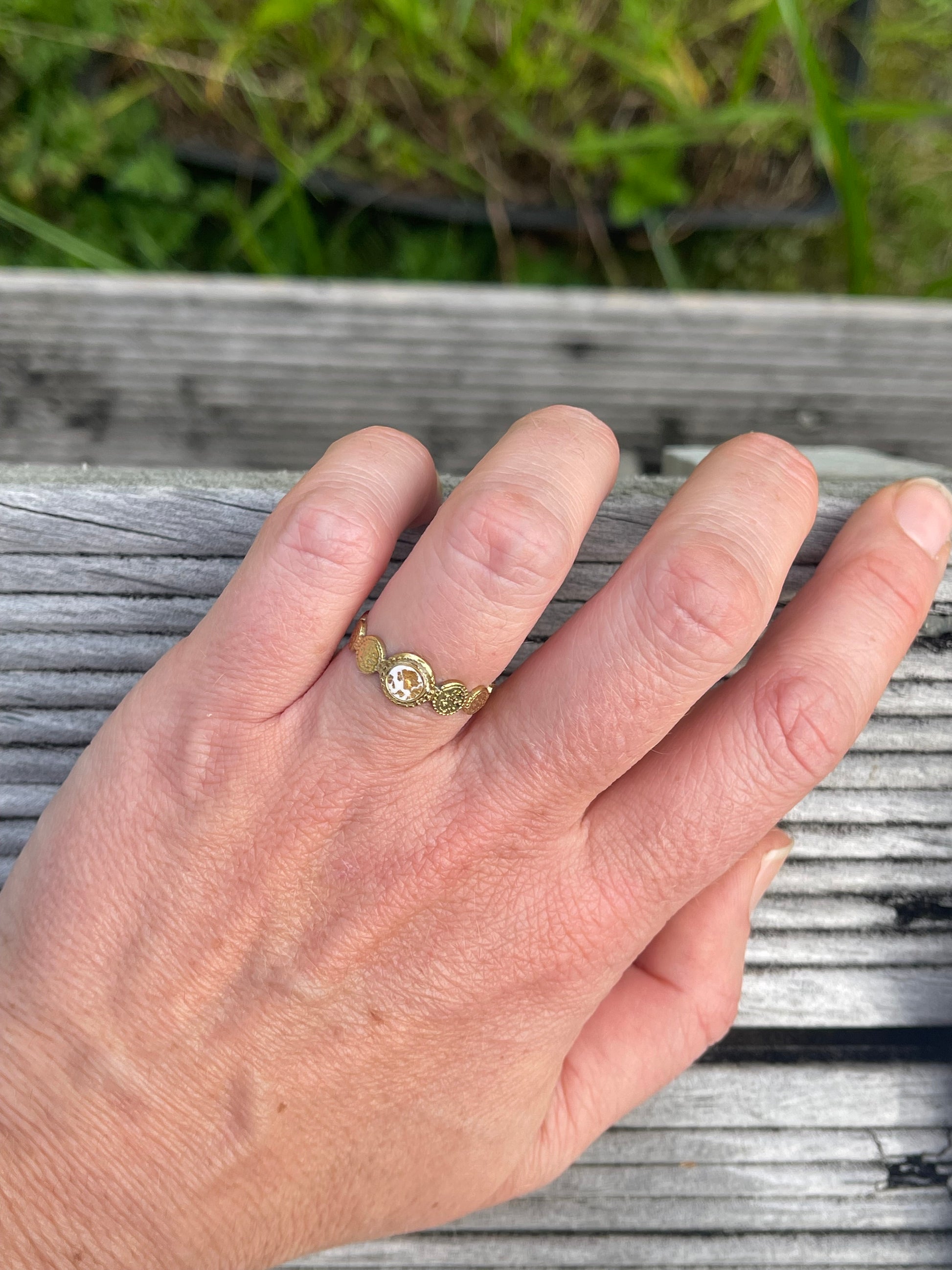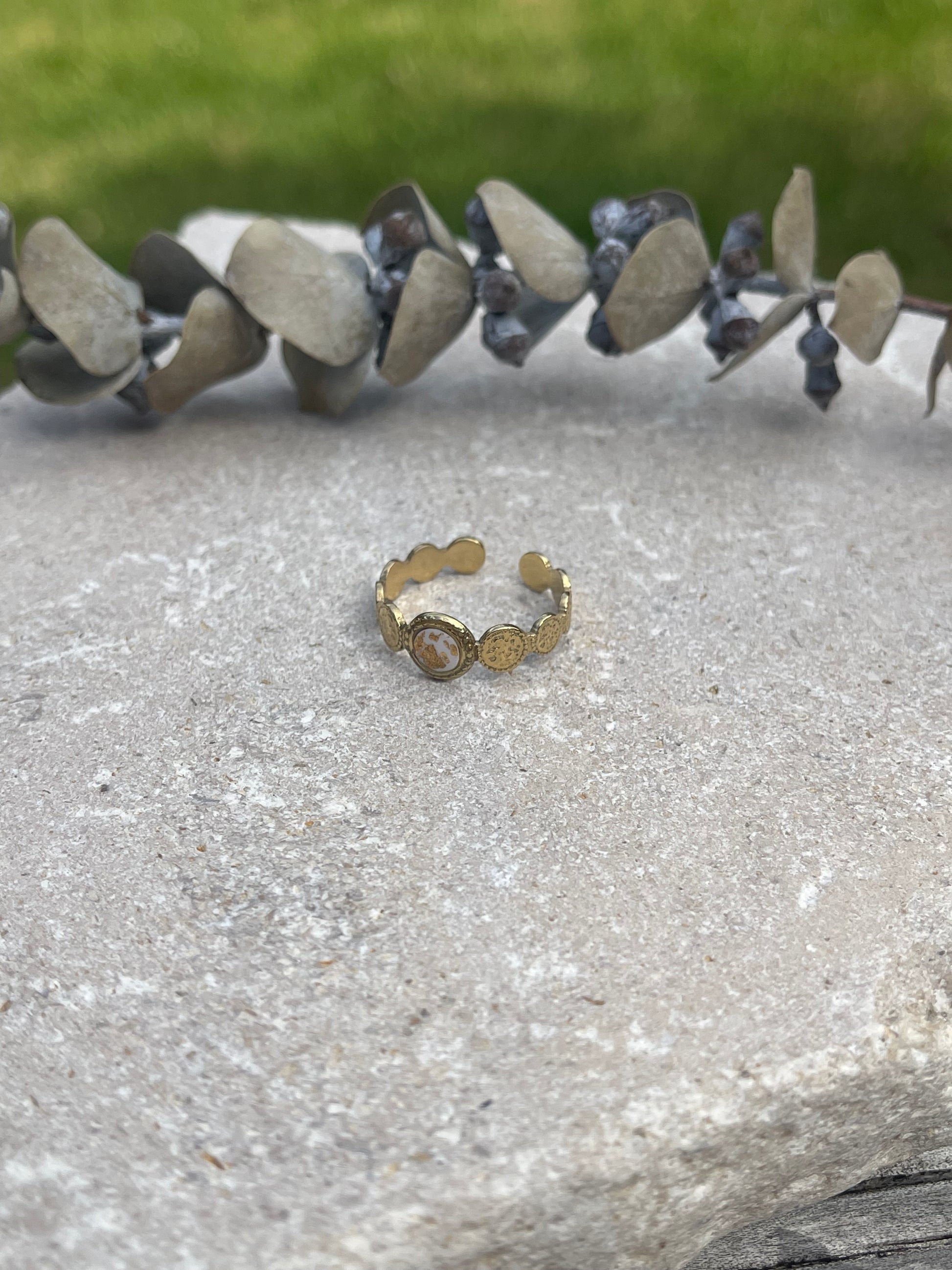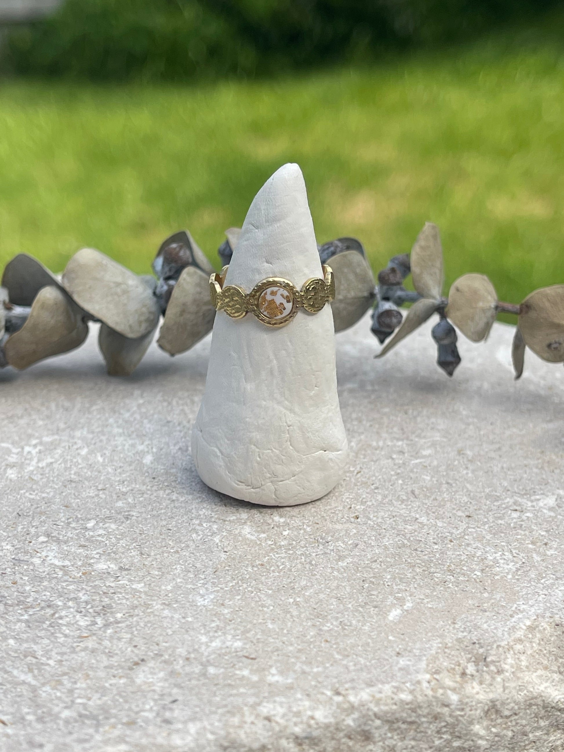 Stainless steel adjustable ring, white colour with golden leaf, topped by resin.