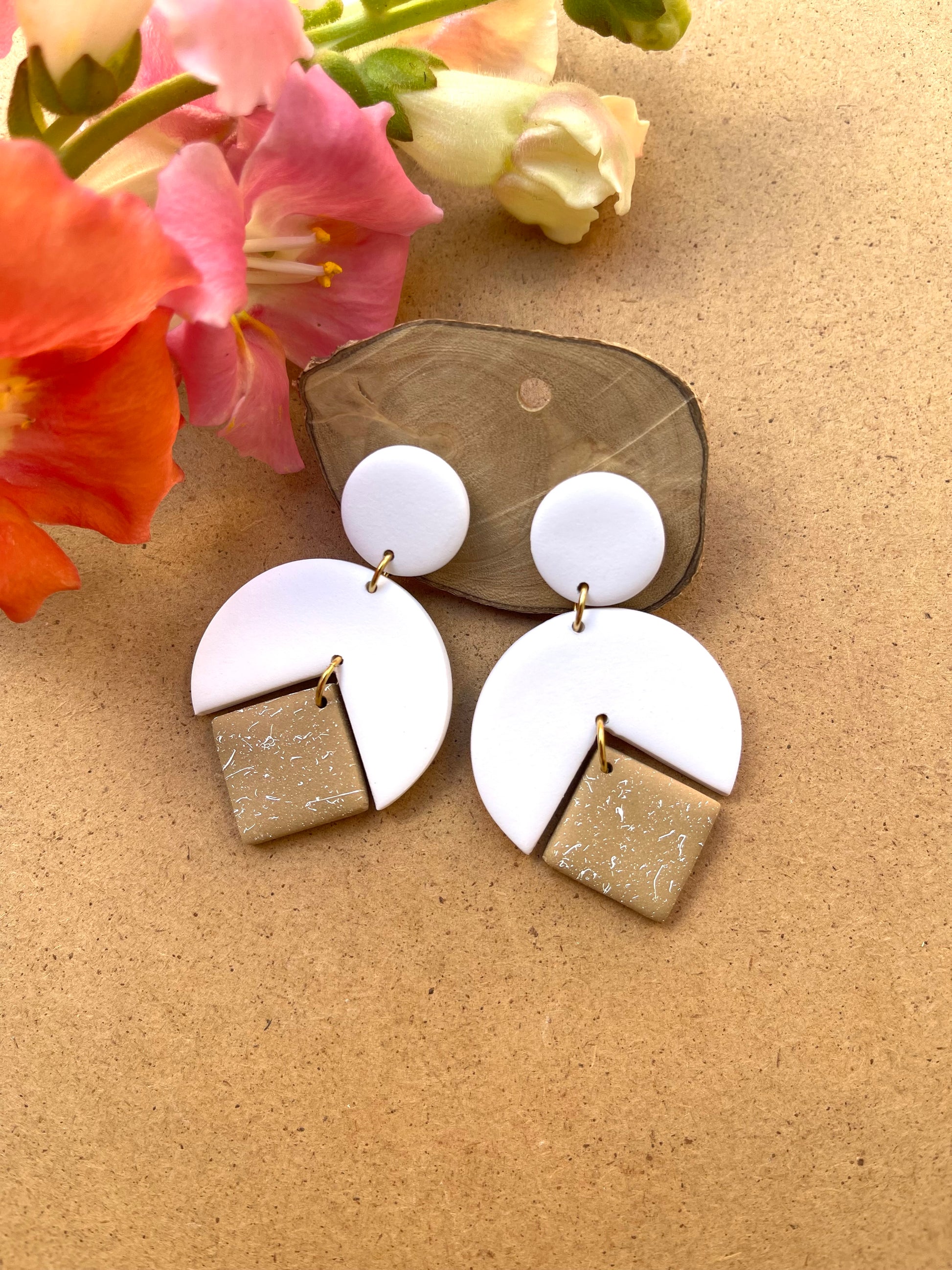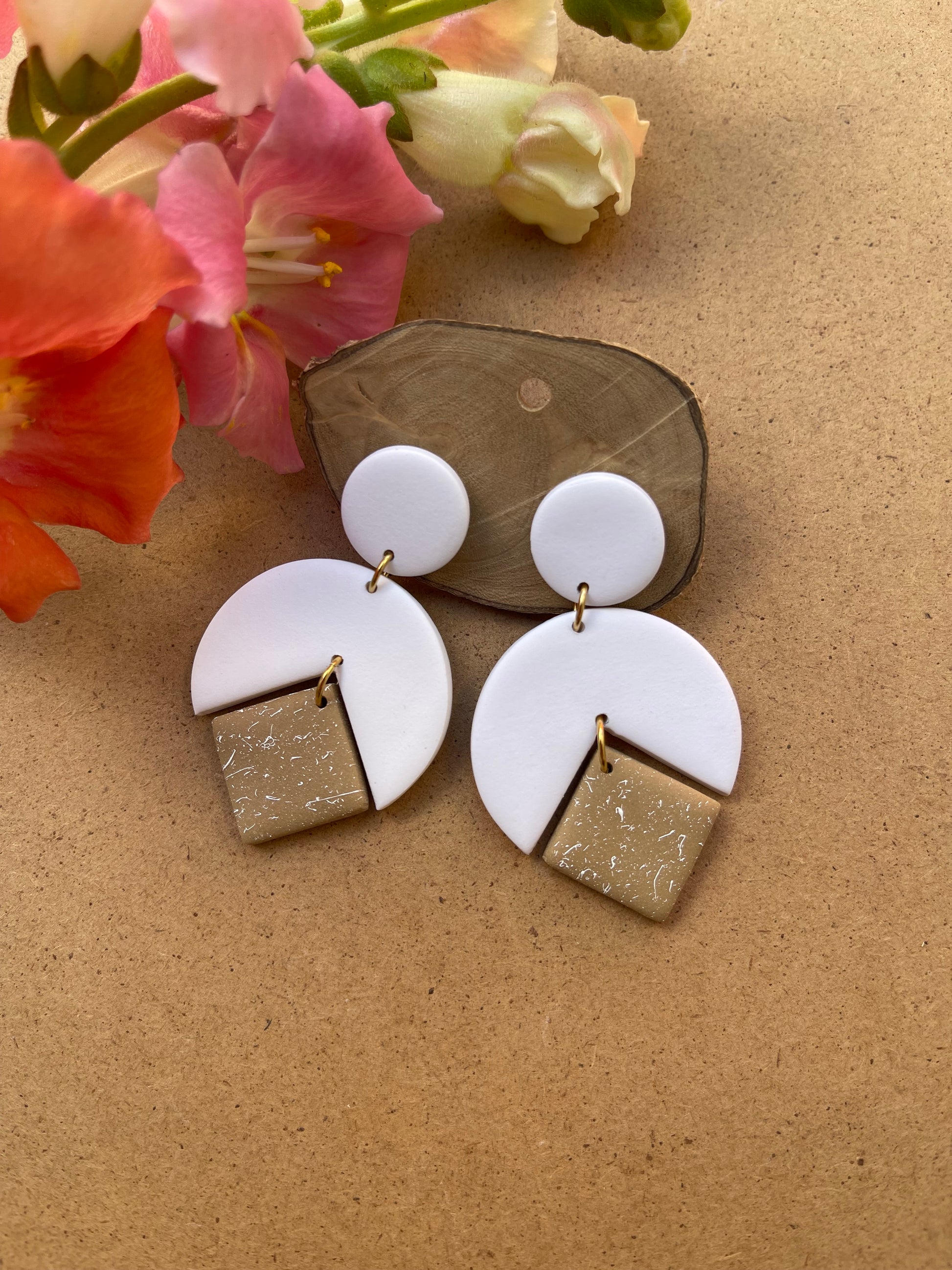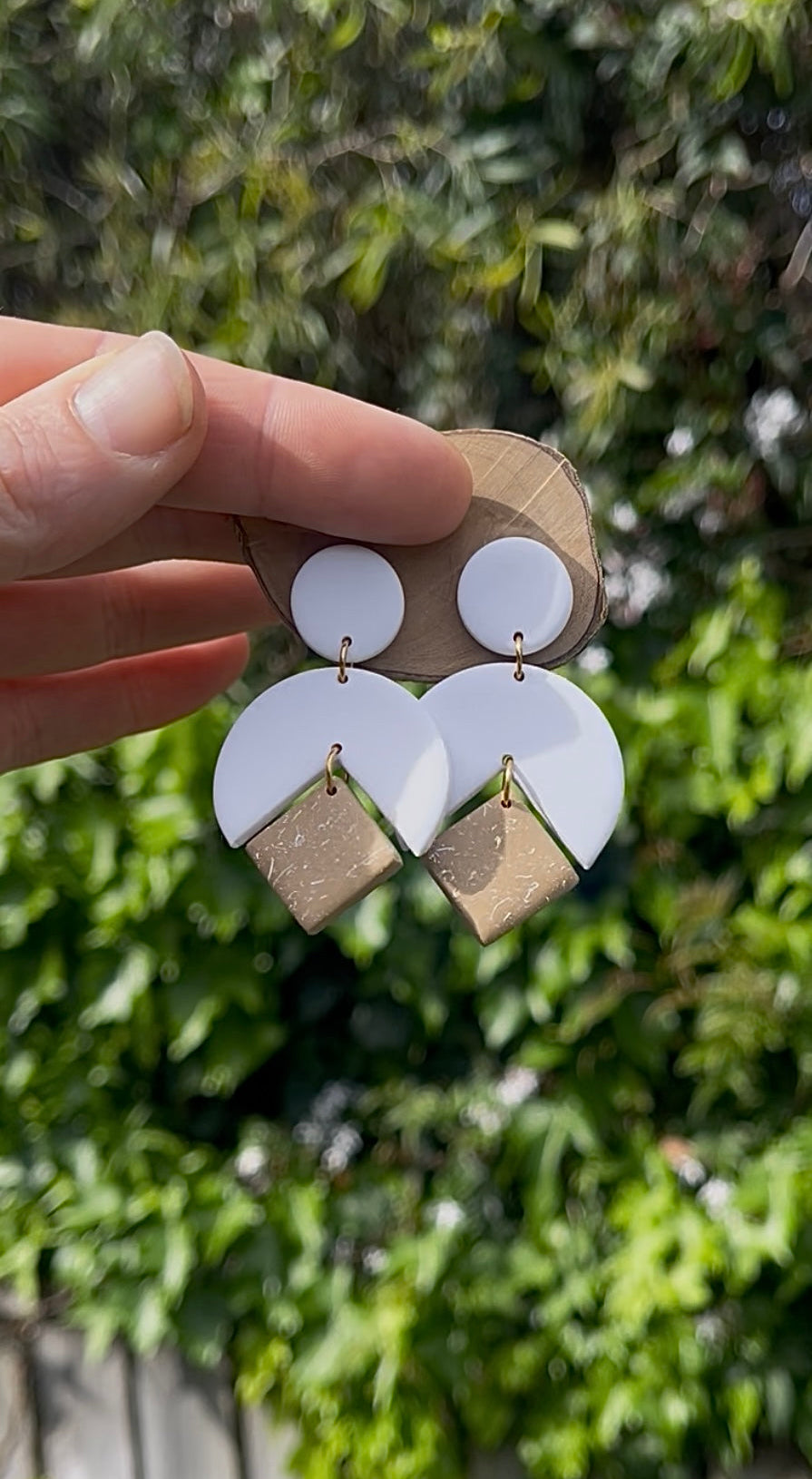 Beautiful dangle white and beige. Extremely light. Clip stainless steel hypoallergenic.