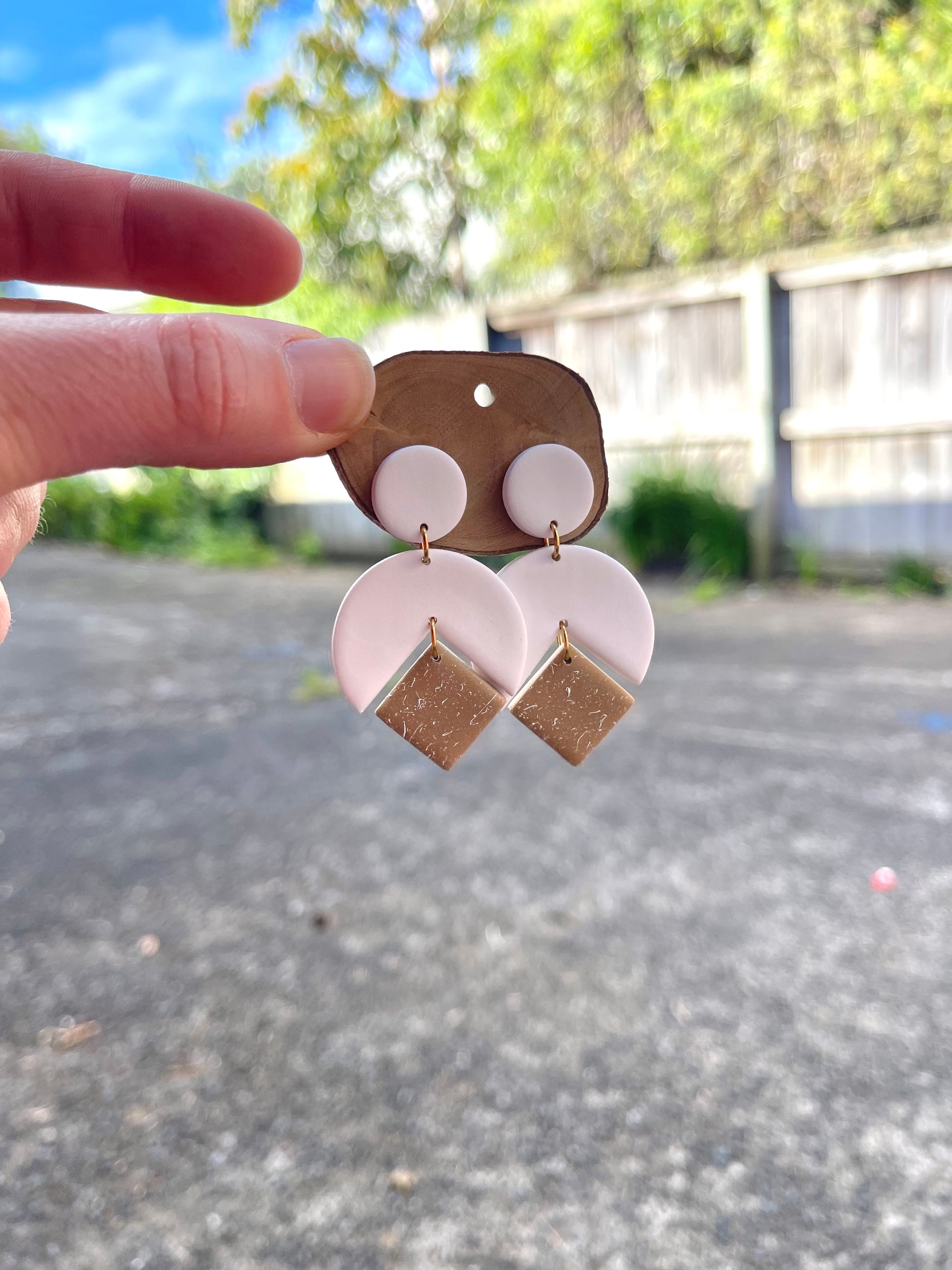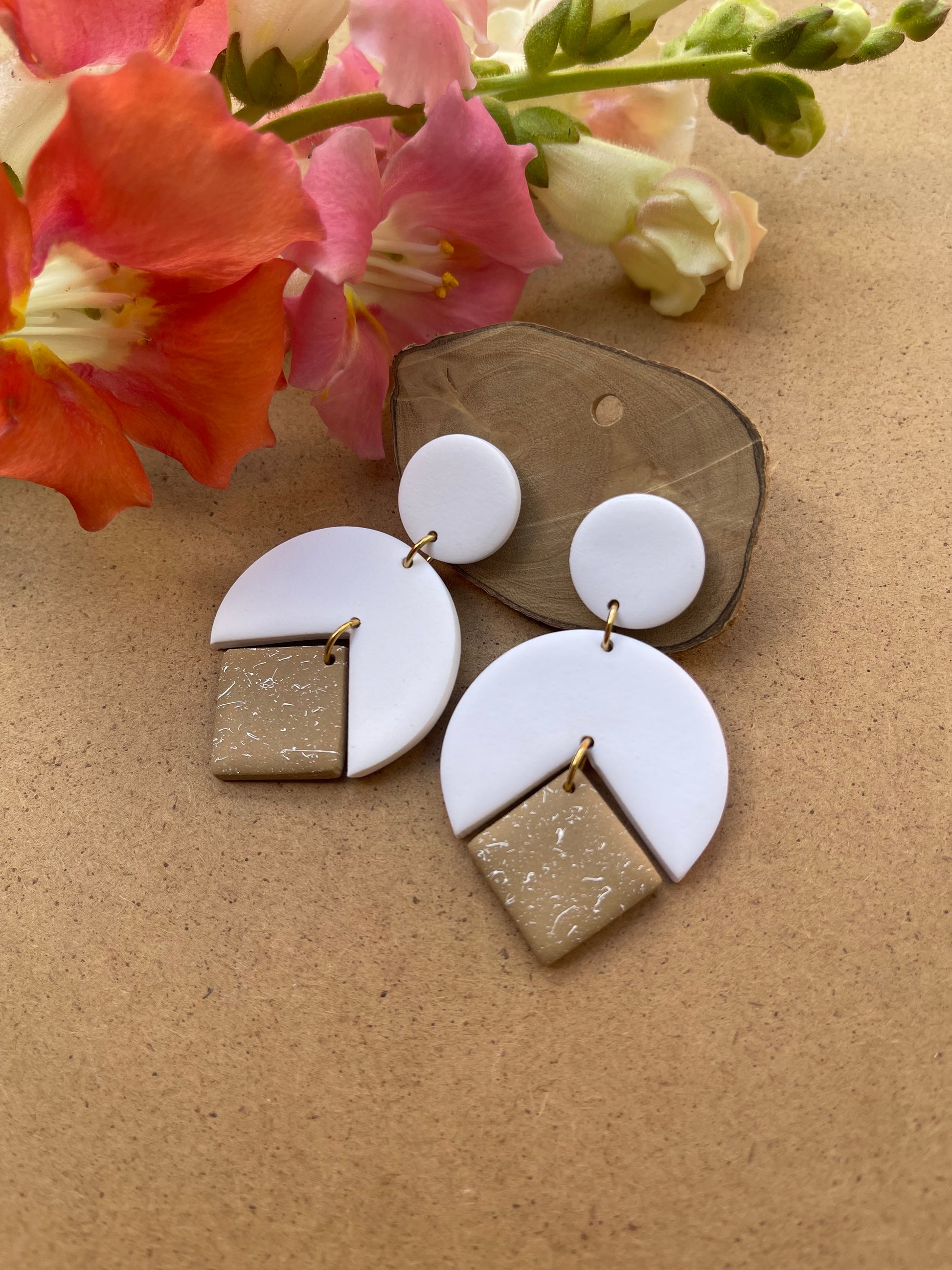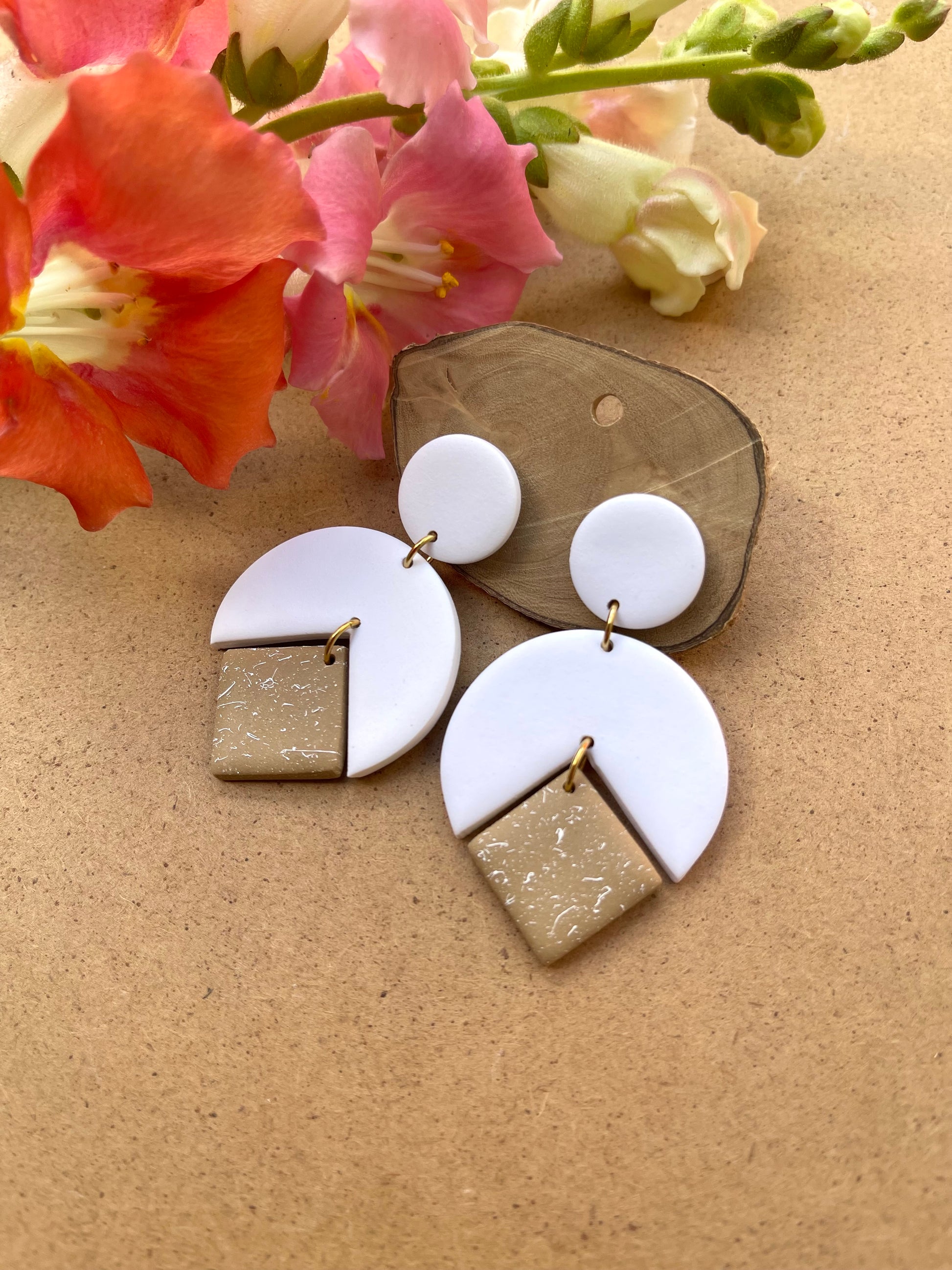Beautiful dangle white and beige. Extremely light. Clip stainless steel hypoallergenic.