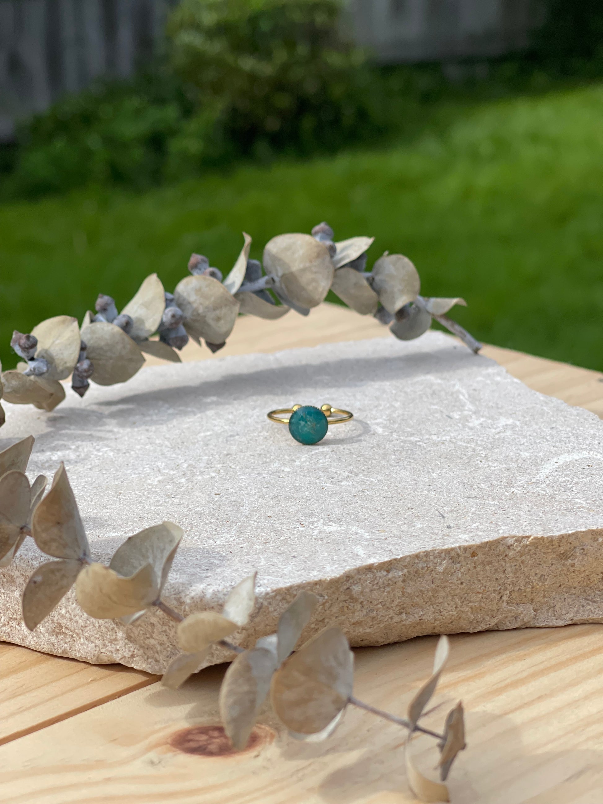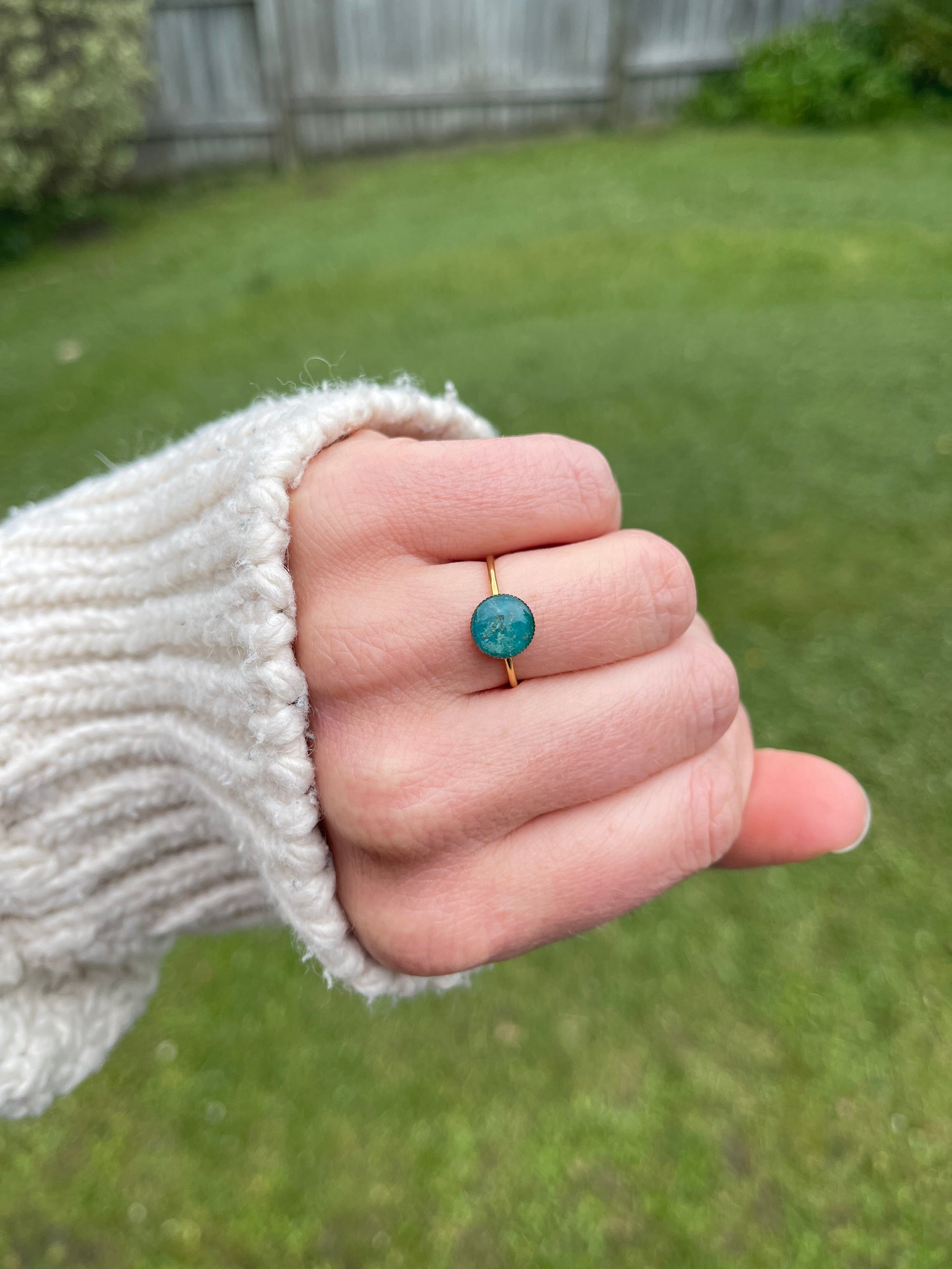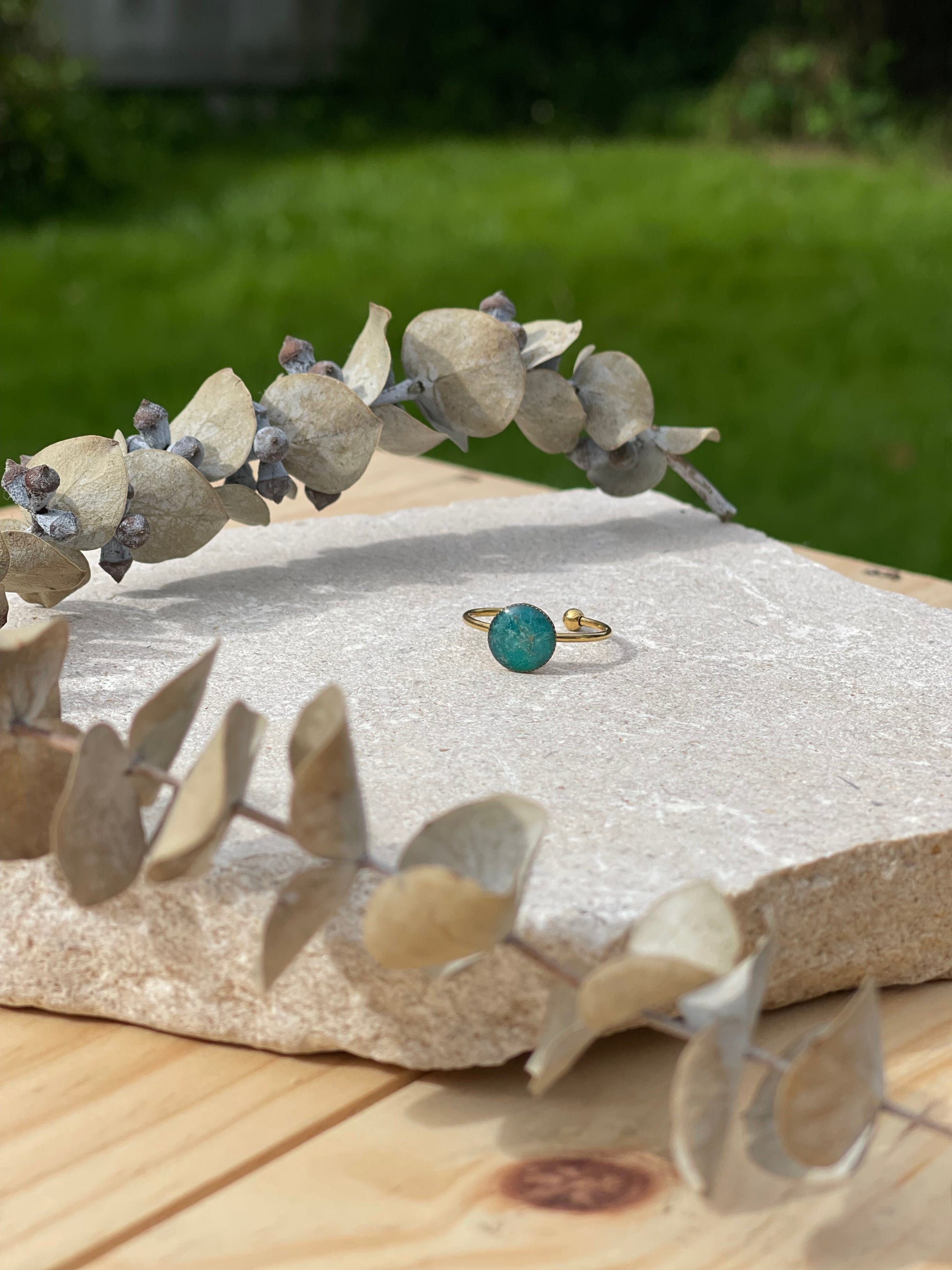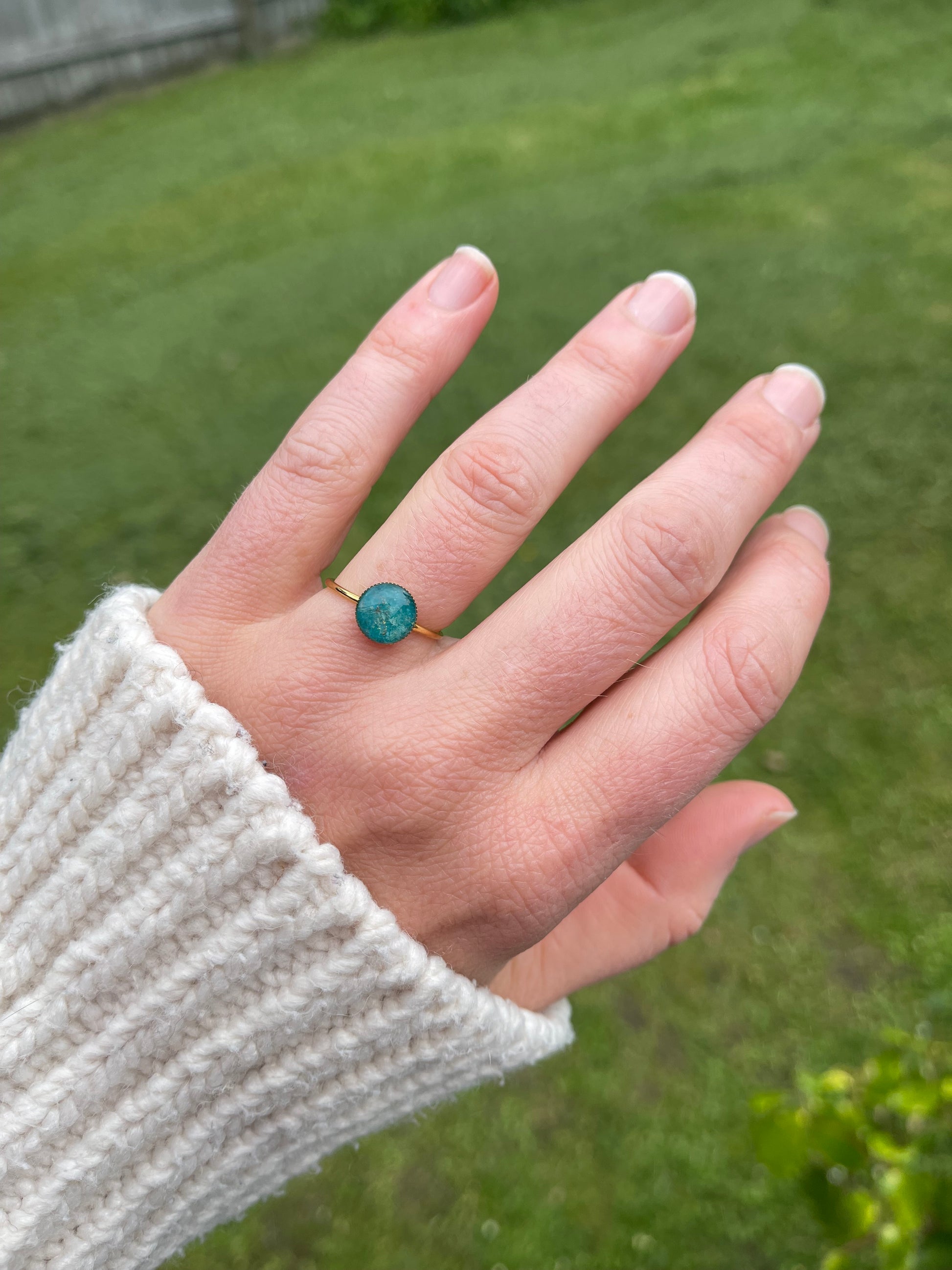 Stainless steel adjustable ring, with turquoise and green colours with golden leaf, topped by resin.