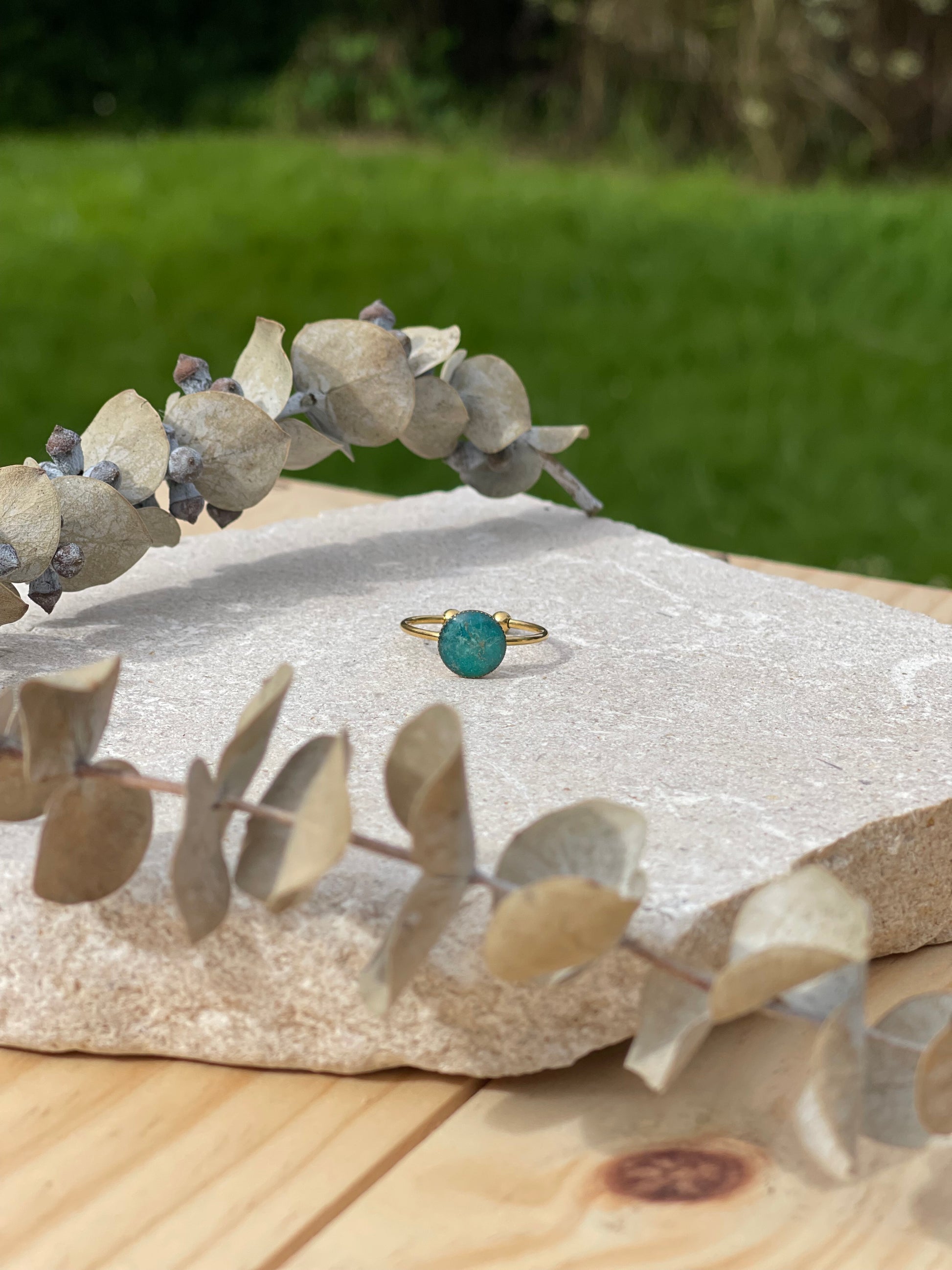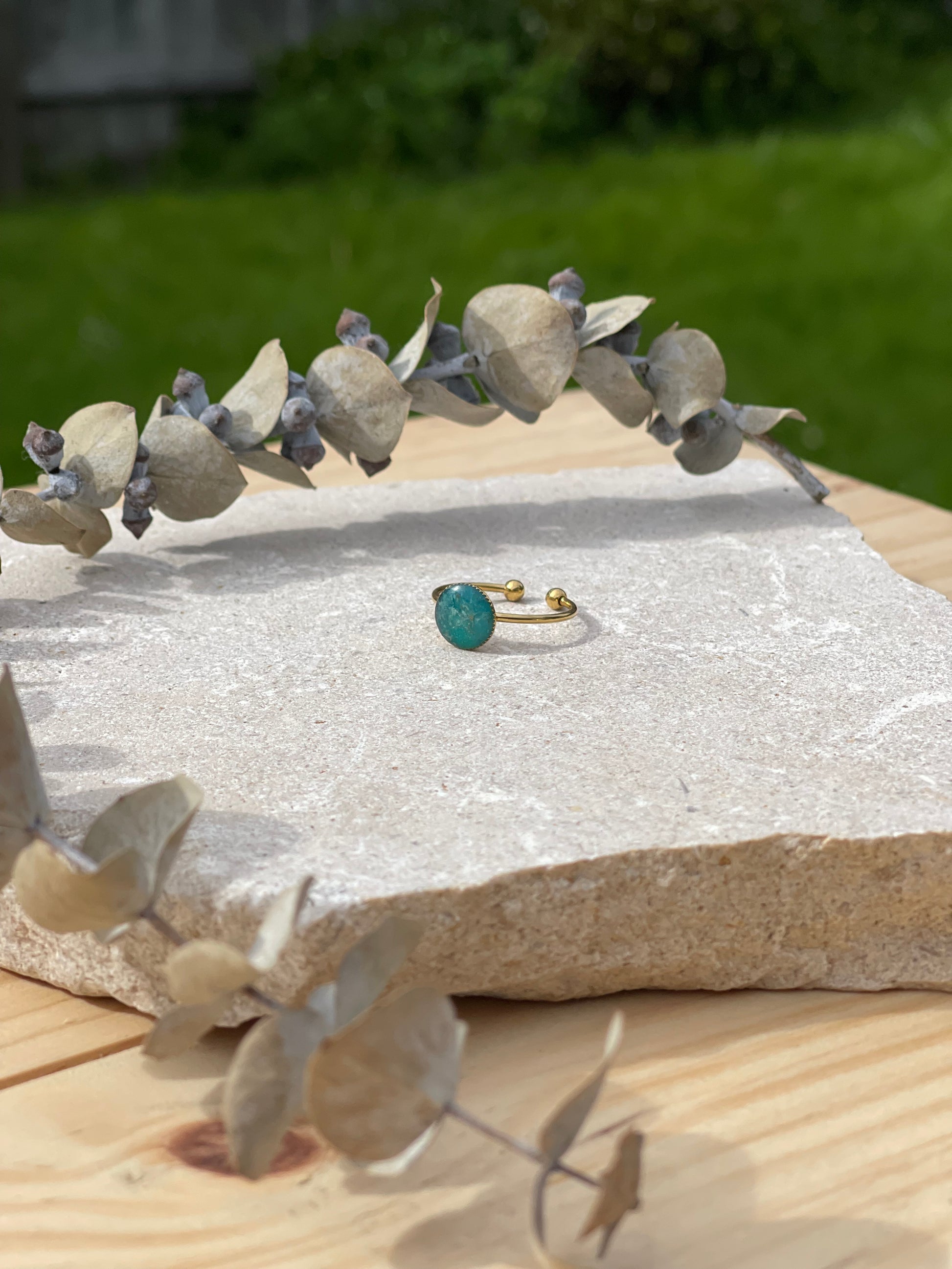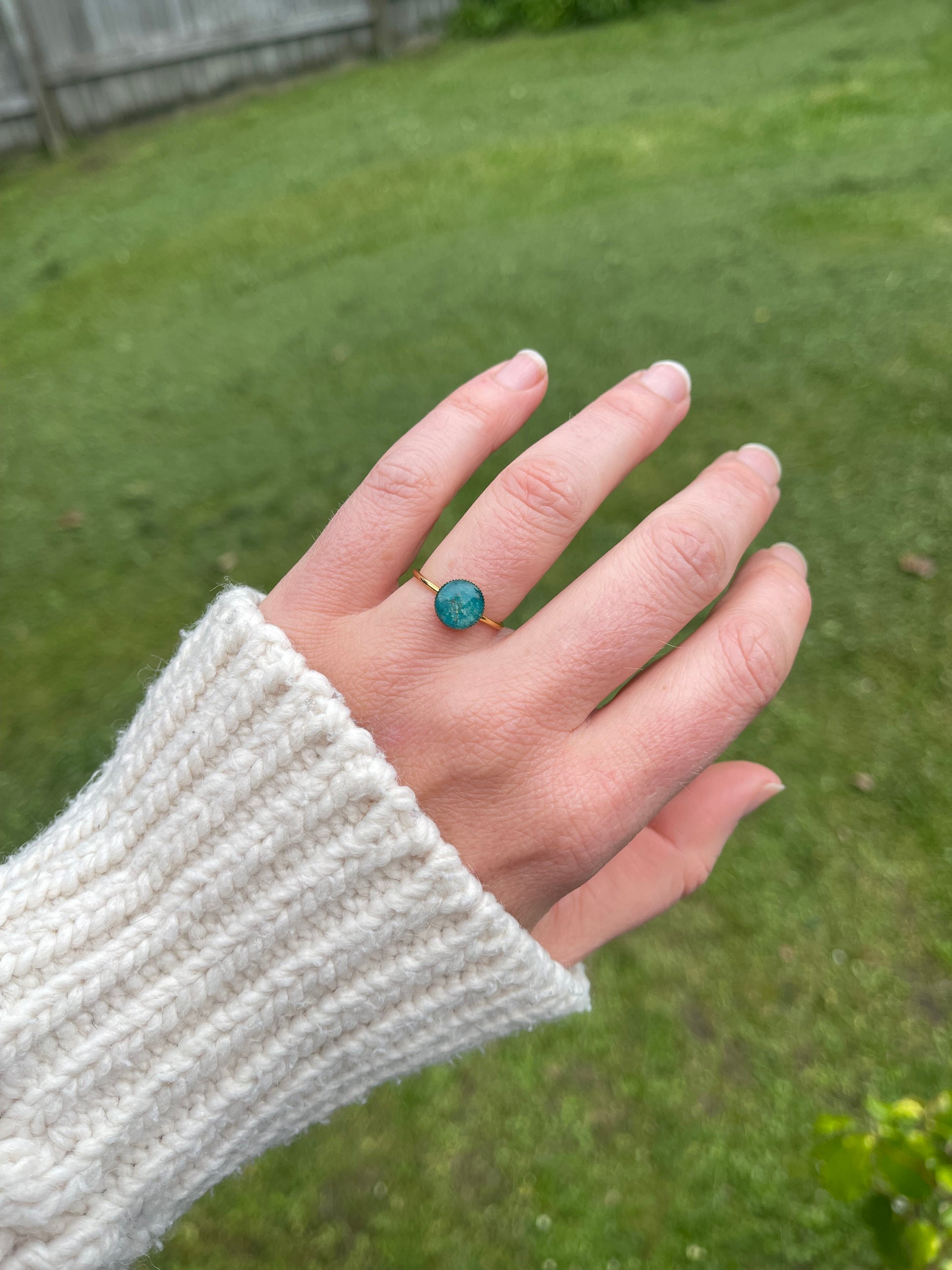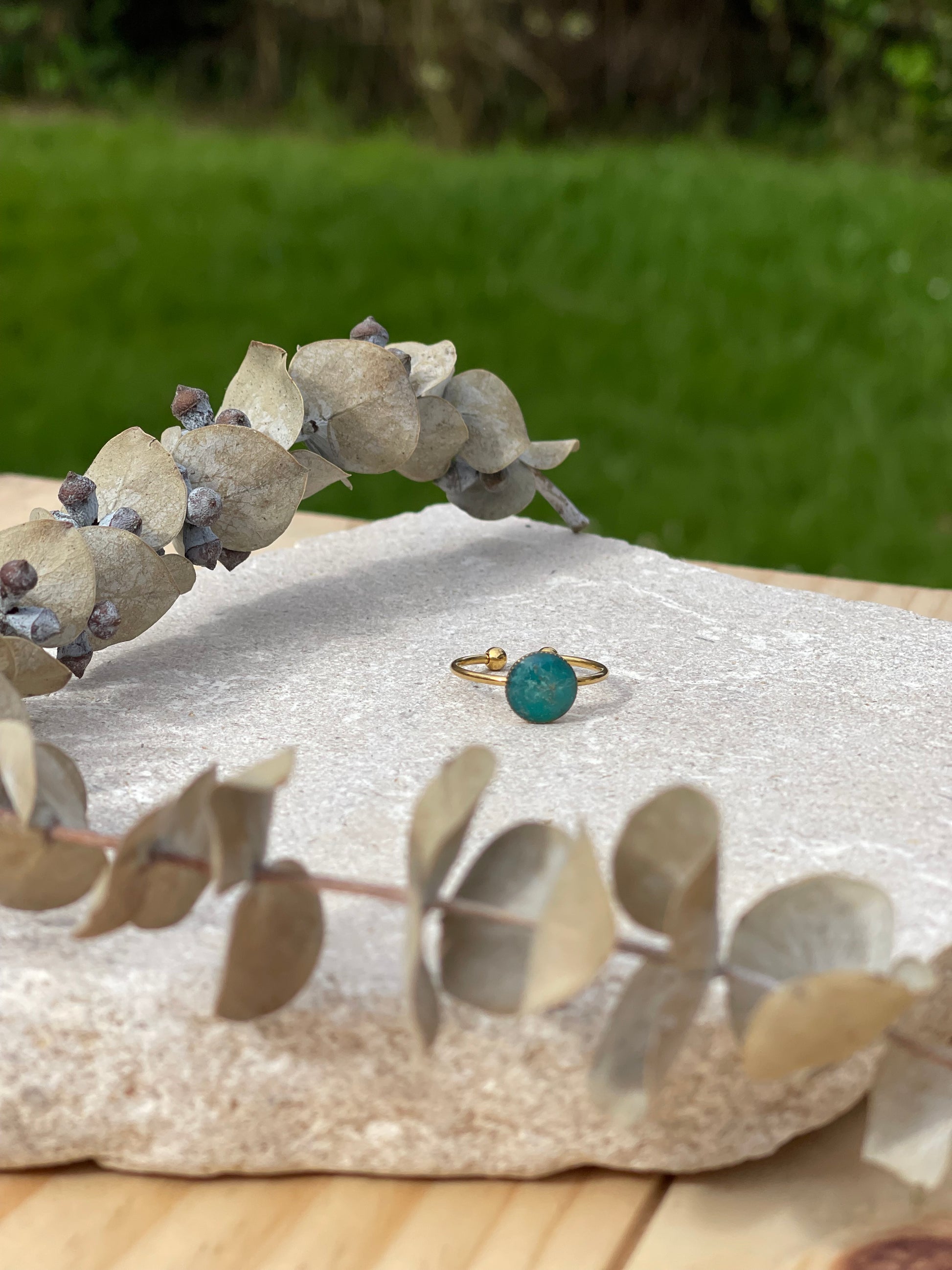 Stainless steel adjustable ring, with turquoise and green colours with golden leaf, topped by resin.