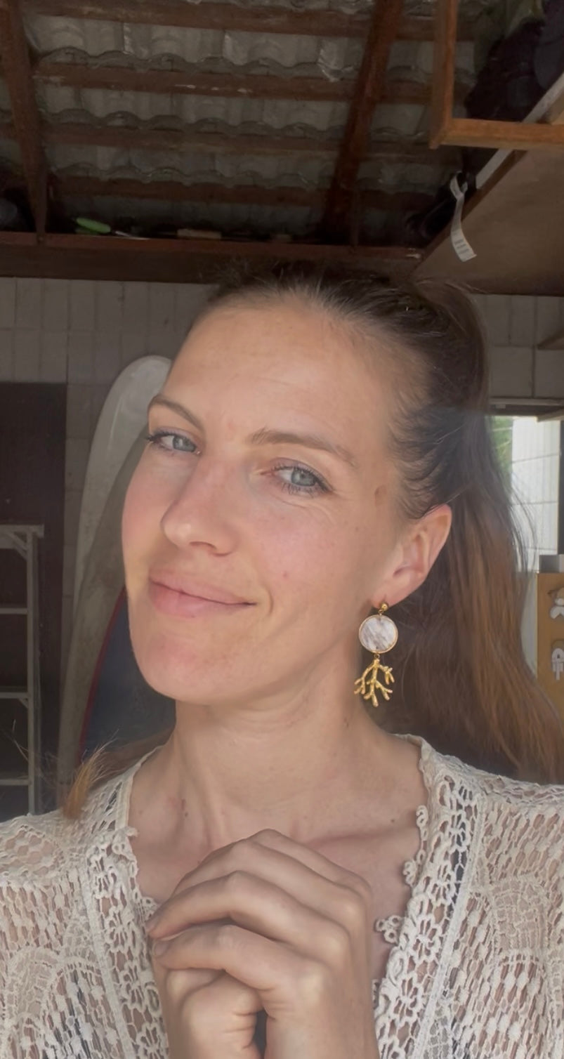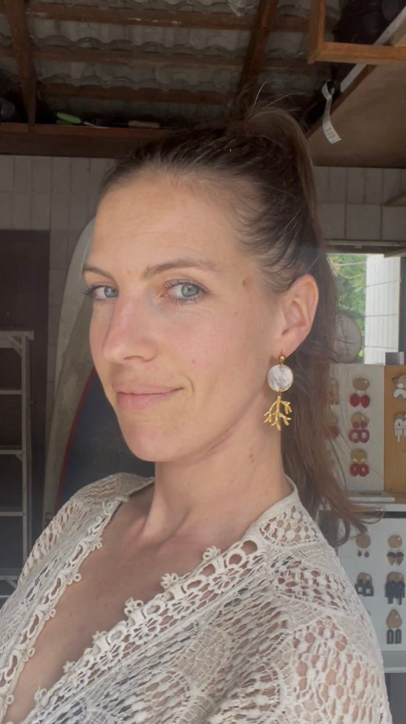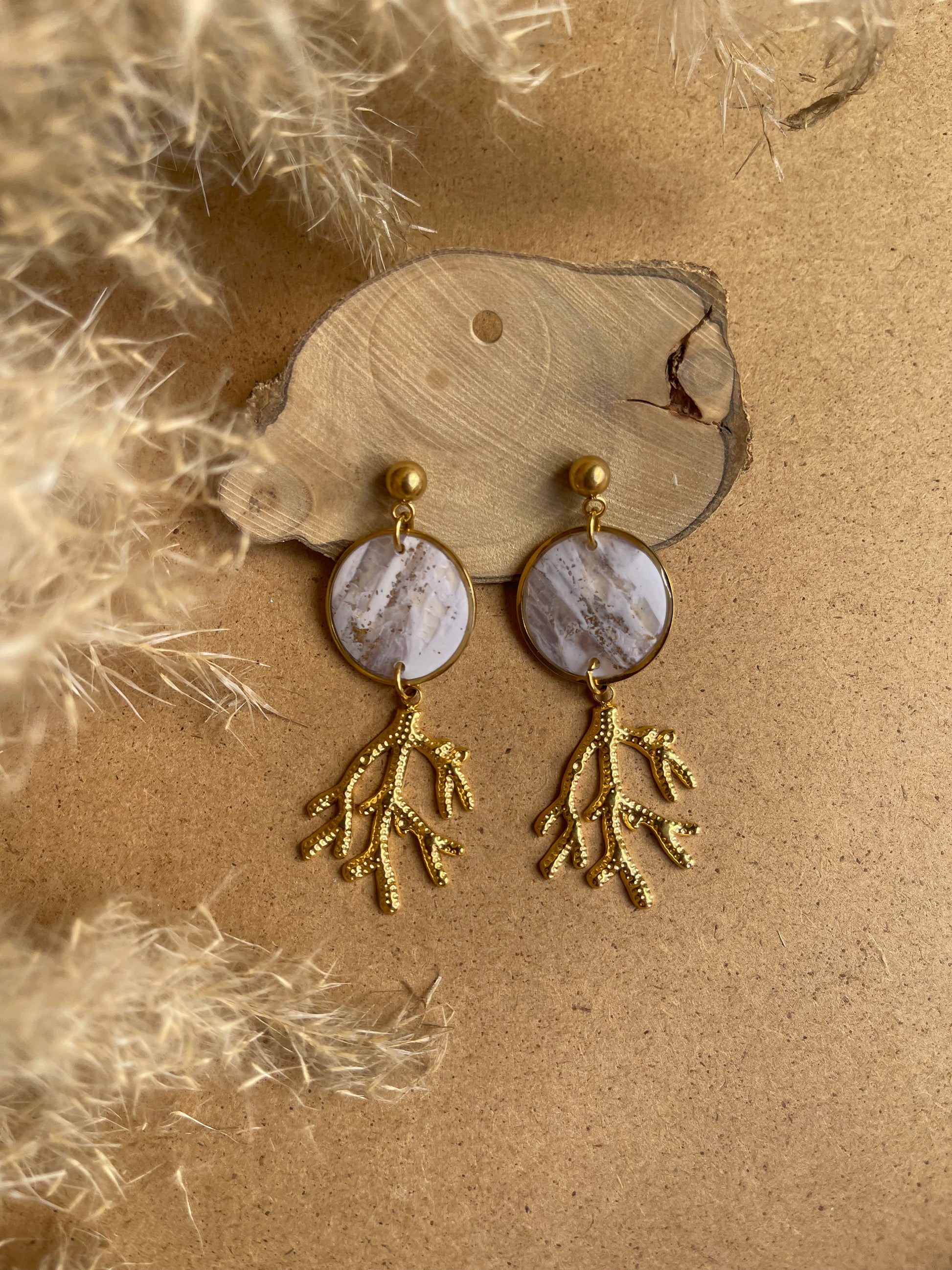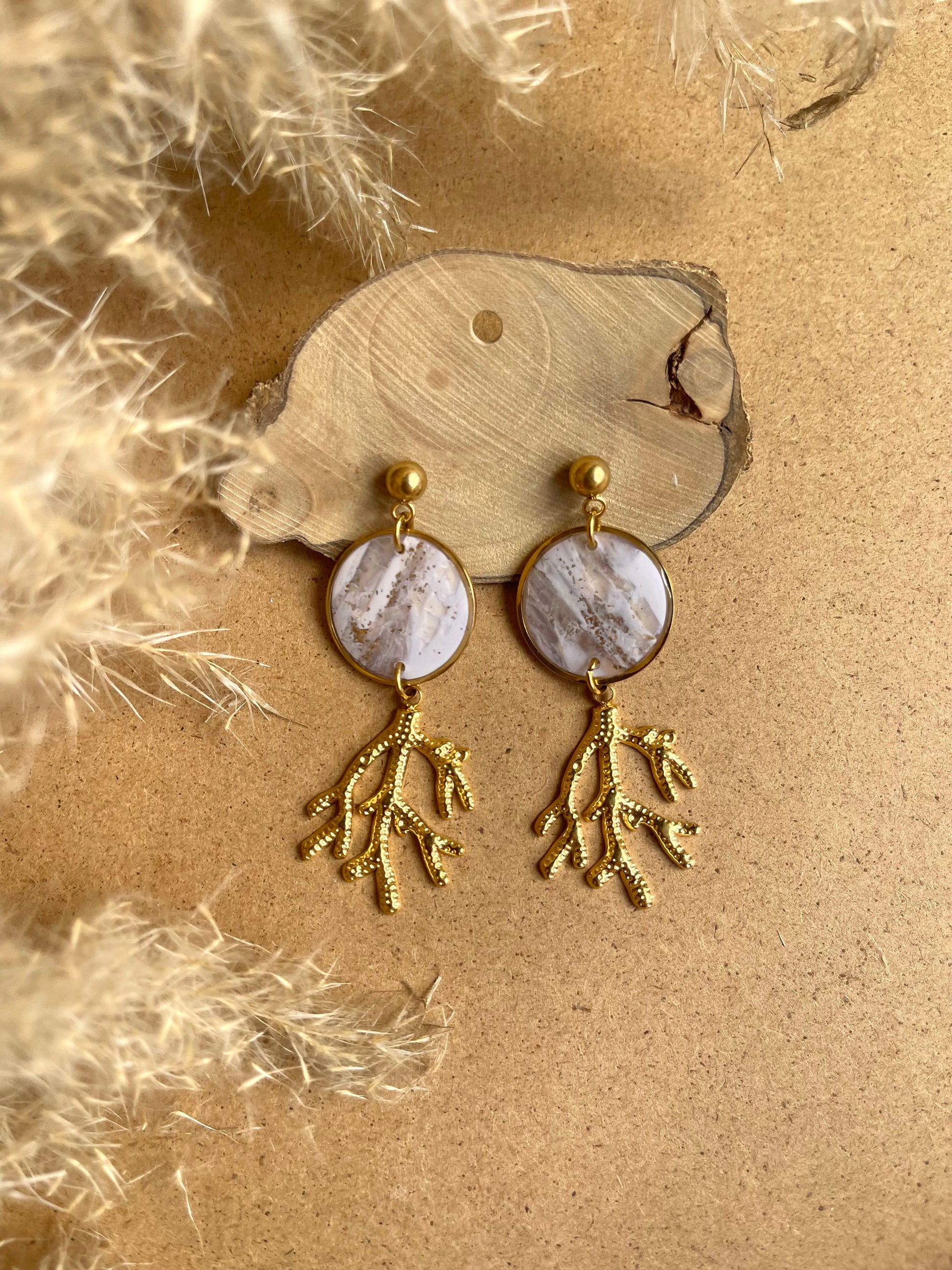 Stainless steel coral, with a delightful mix of white, translucent and golden leaf, topped by resin. Stainless steel hypoallergenic clip.