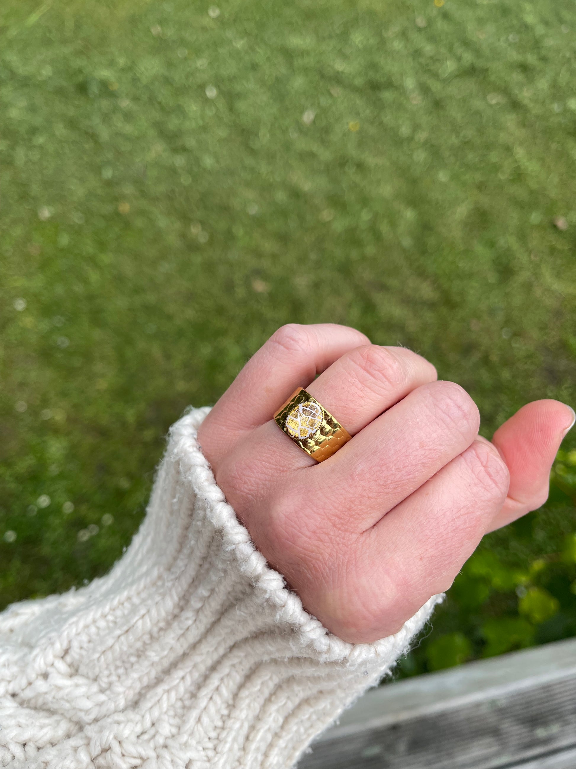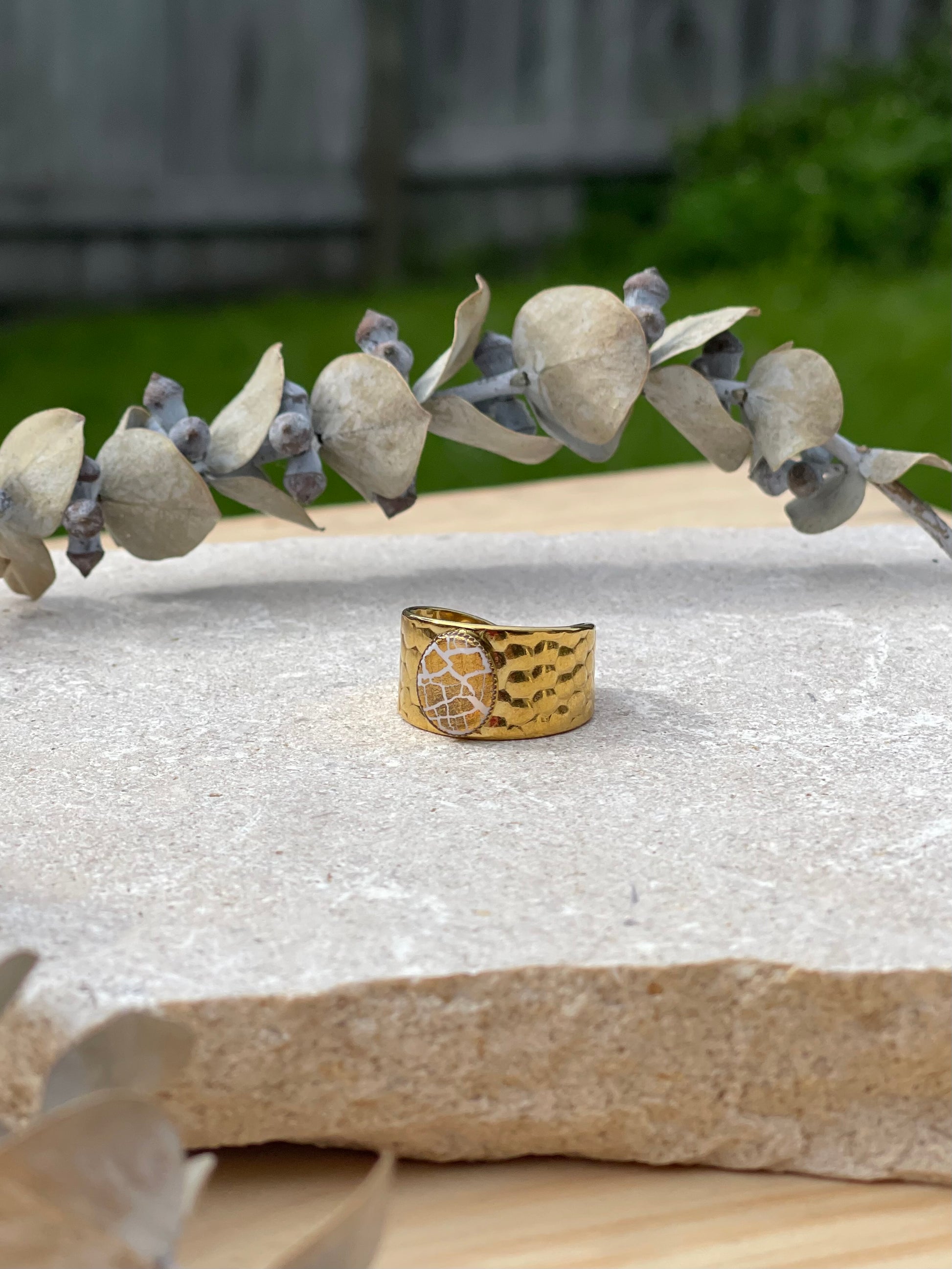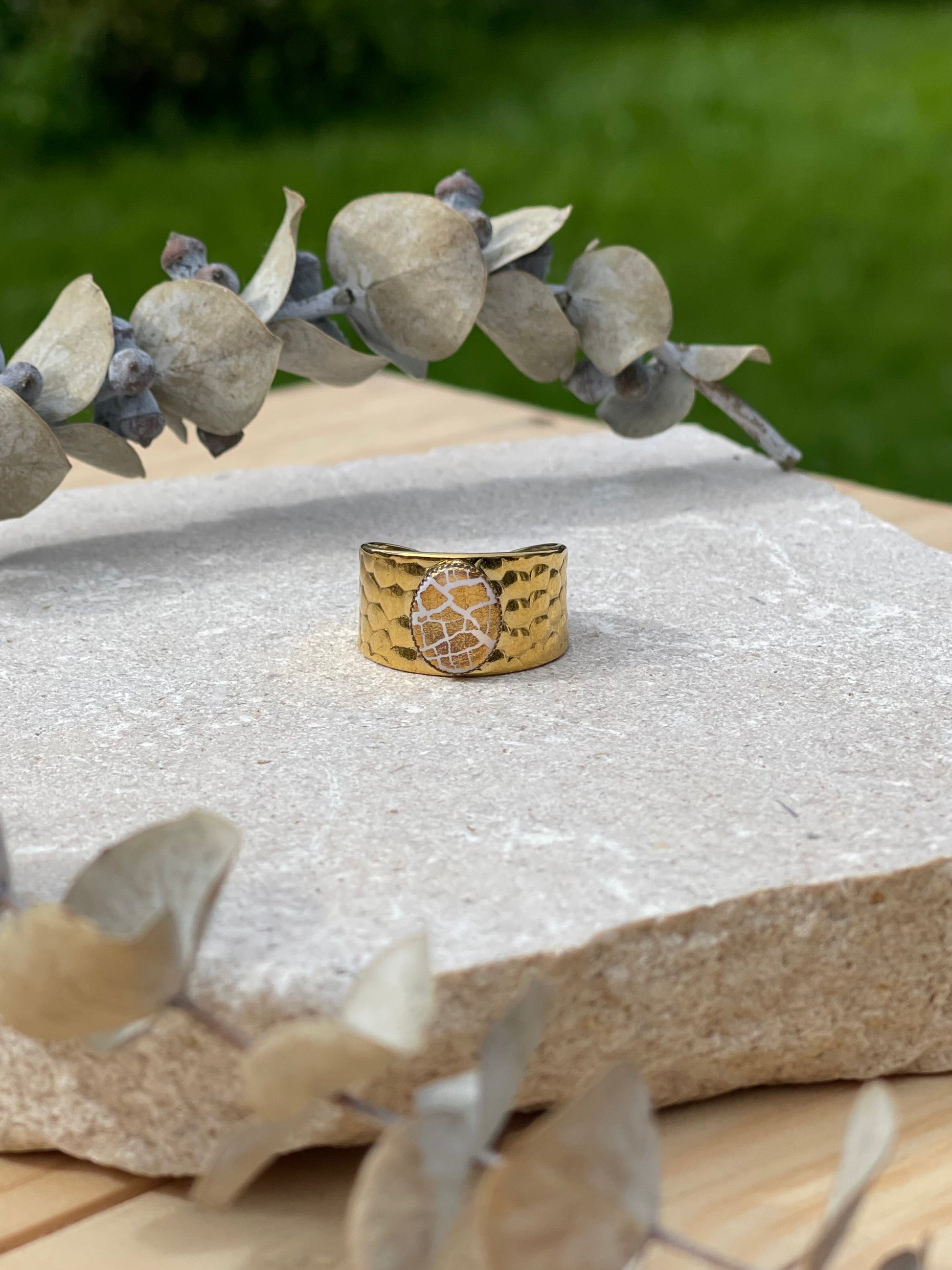 Stainless steel adjustable ring, white colour with golden leaf, topped by resin.
