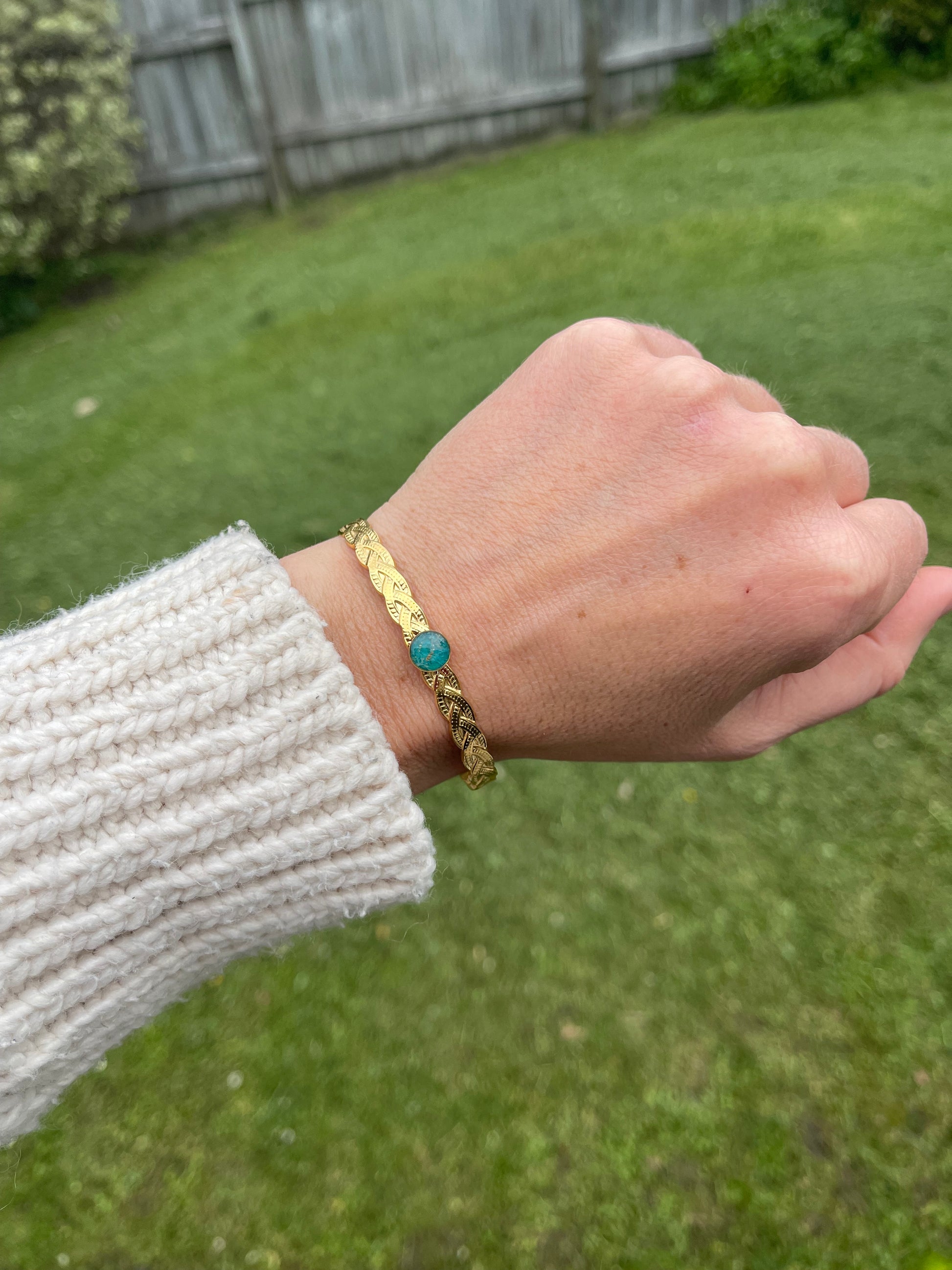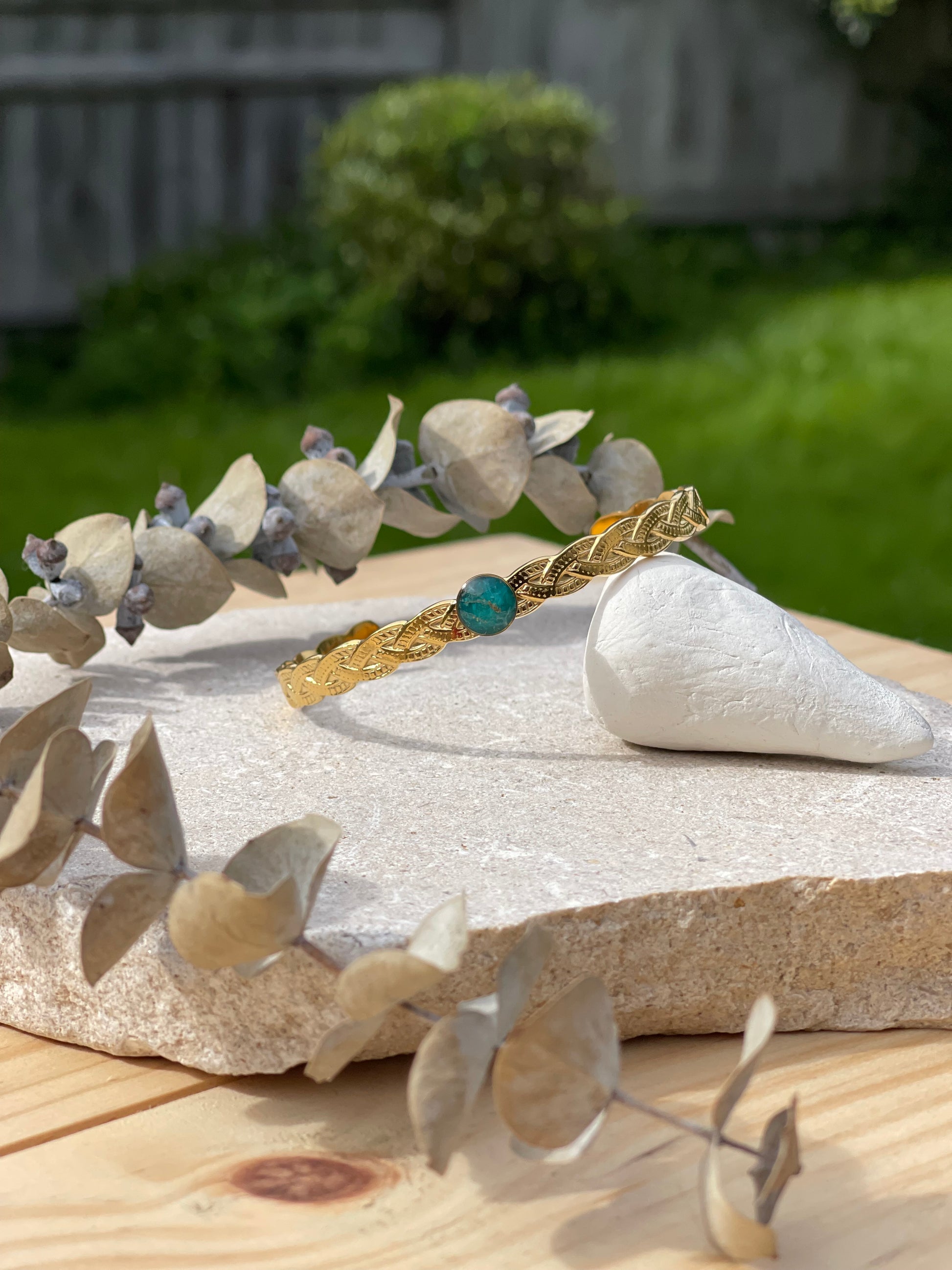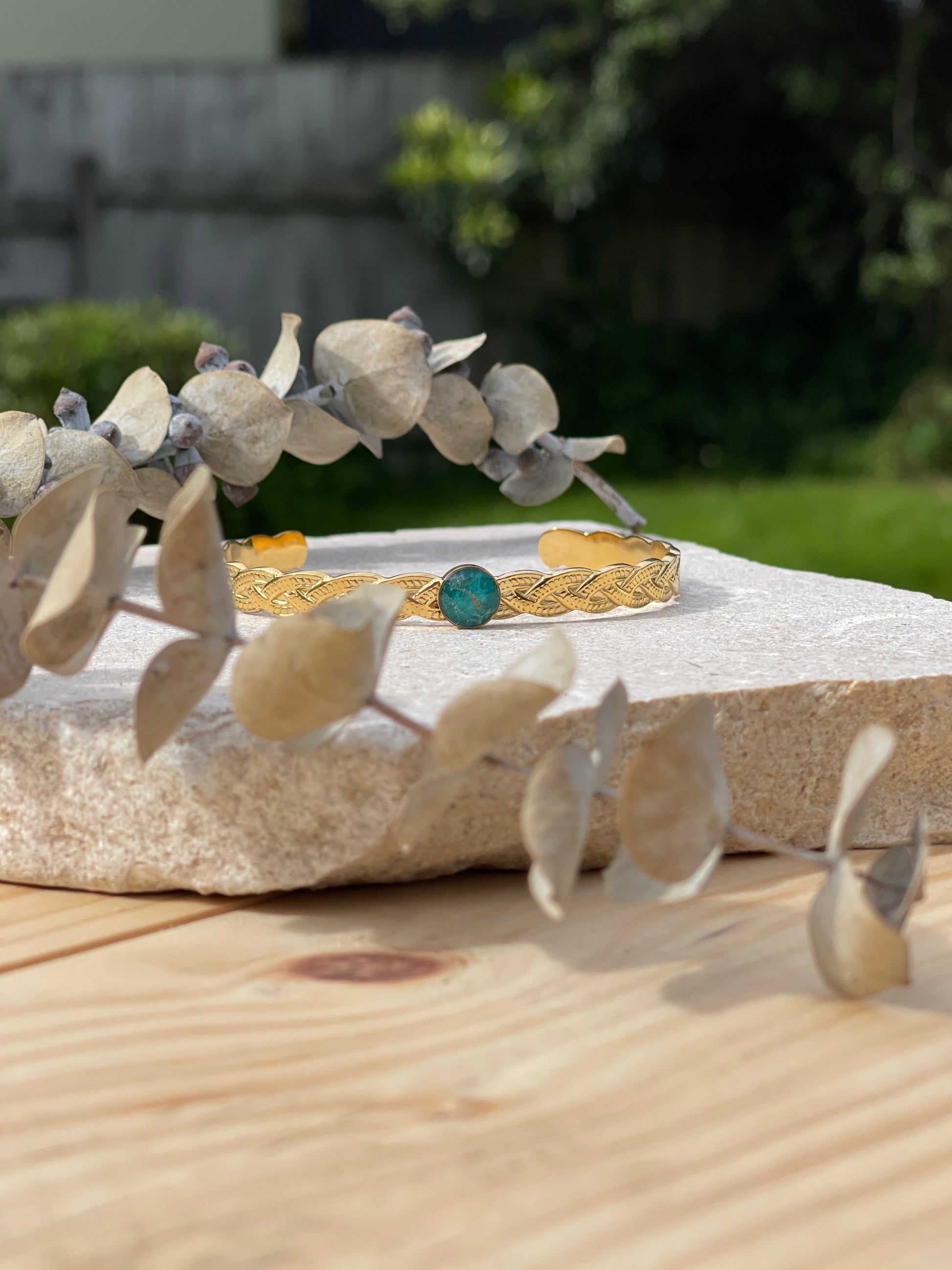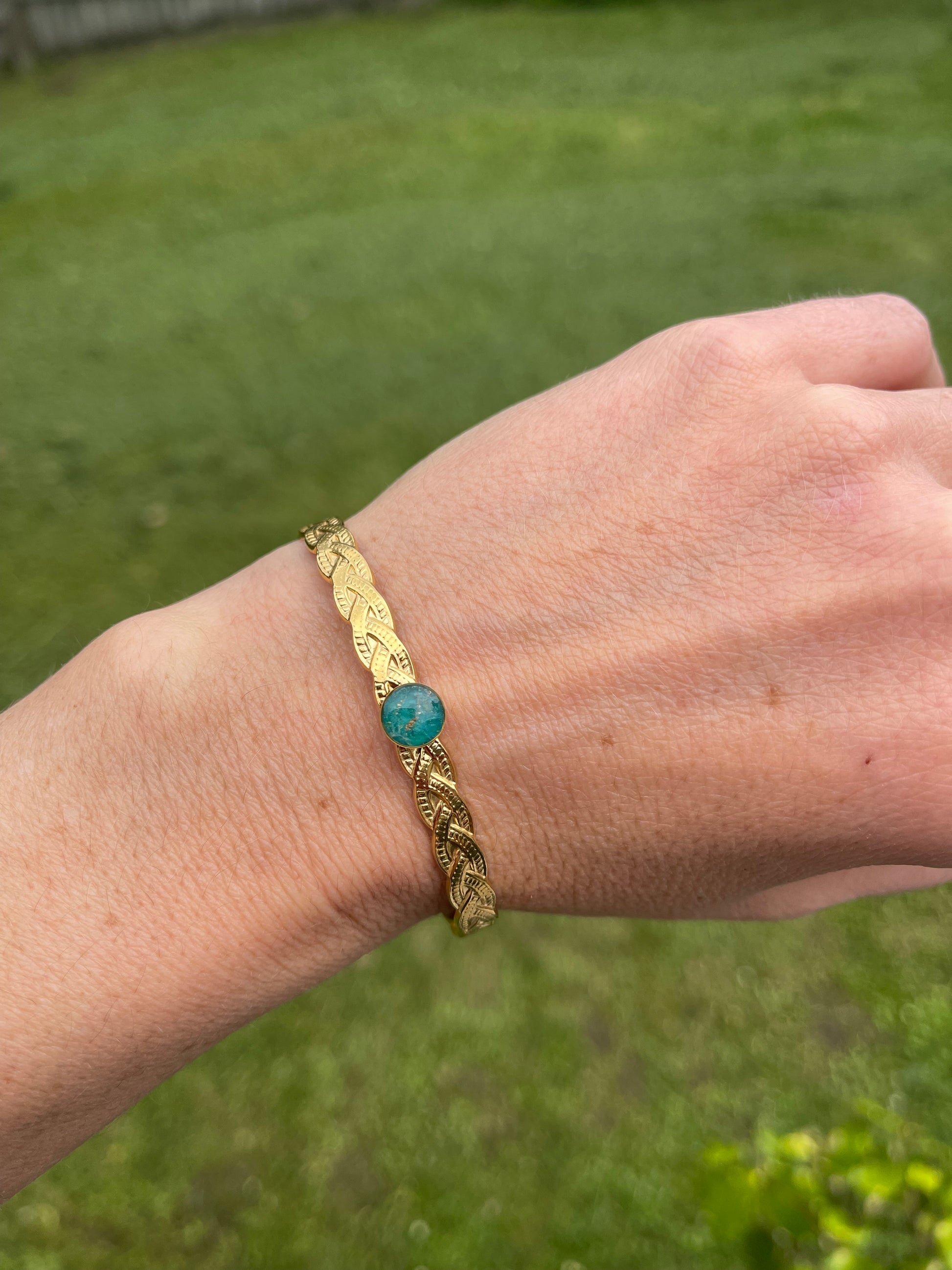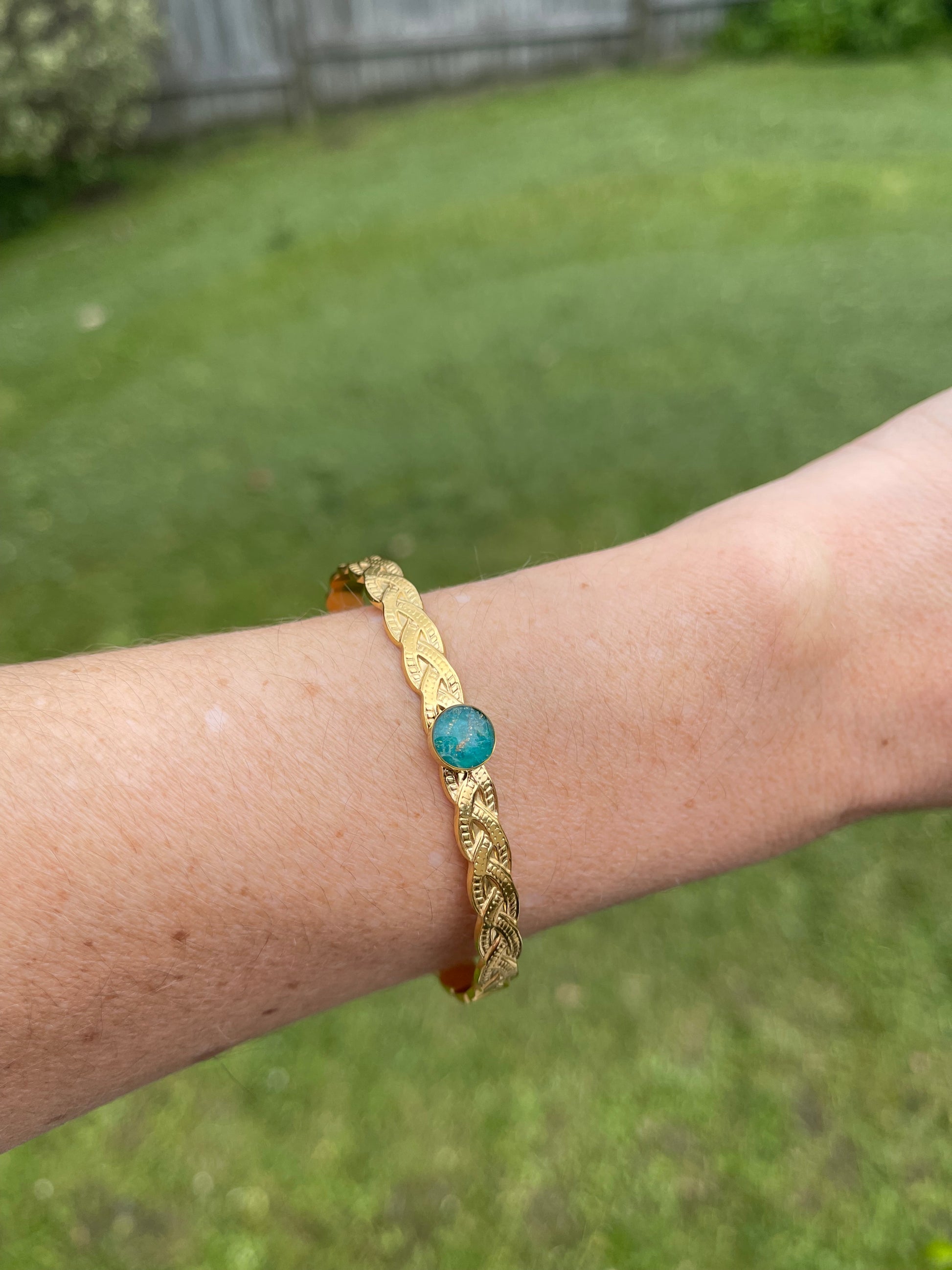 Stainless steel adjustable bracelet, blue/green colour with golden leaf, gem effect, topped by resin.