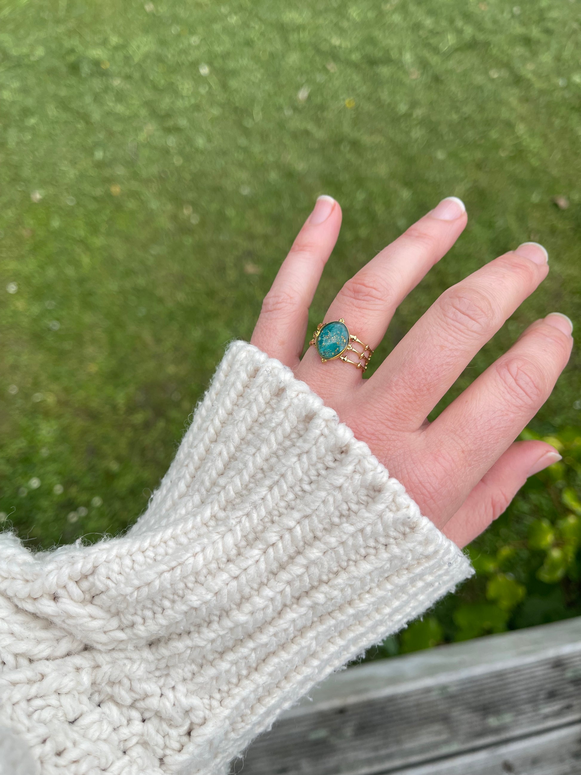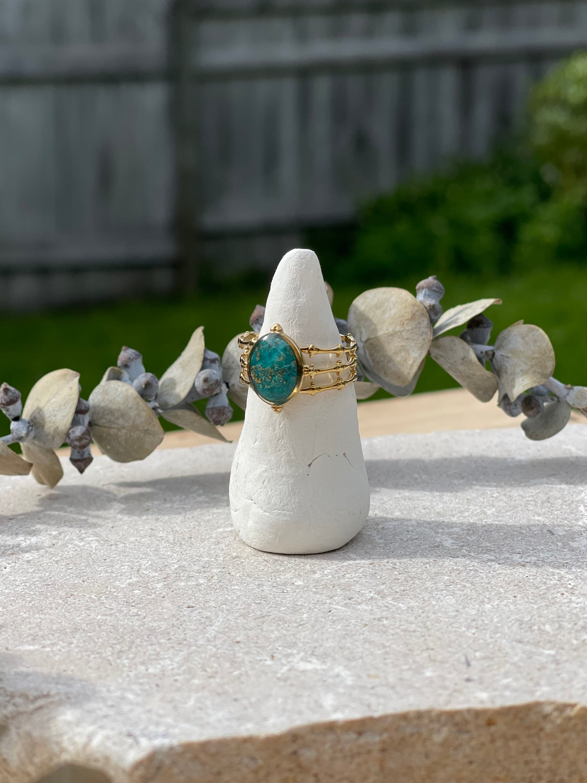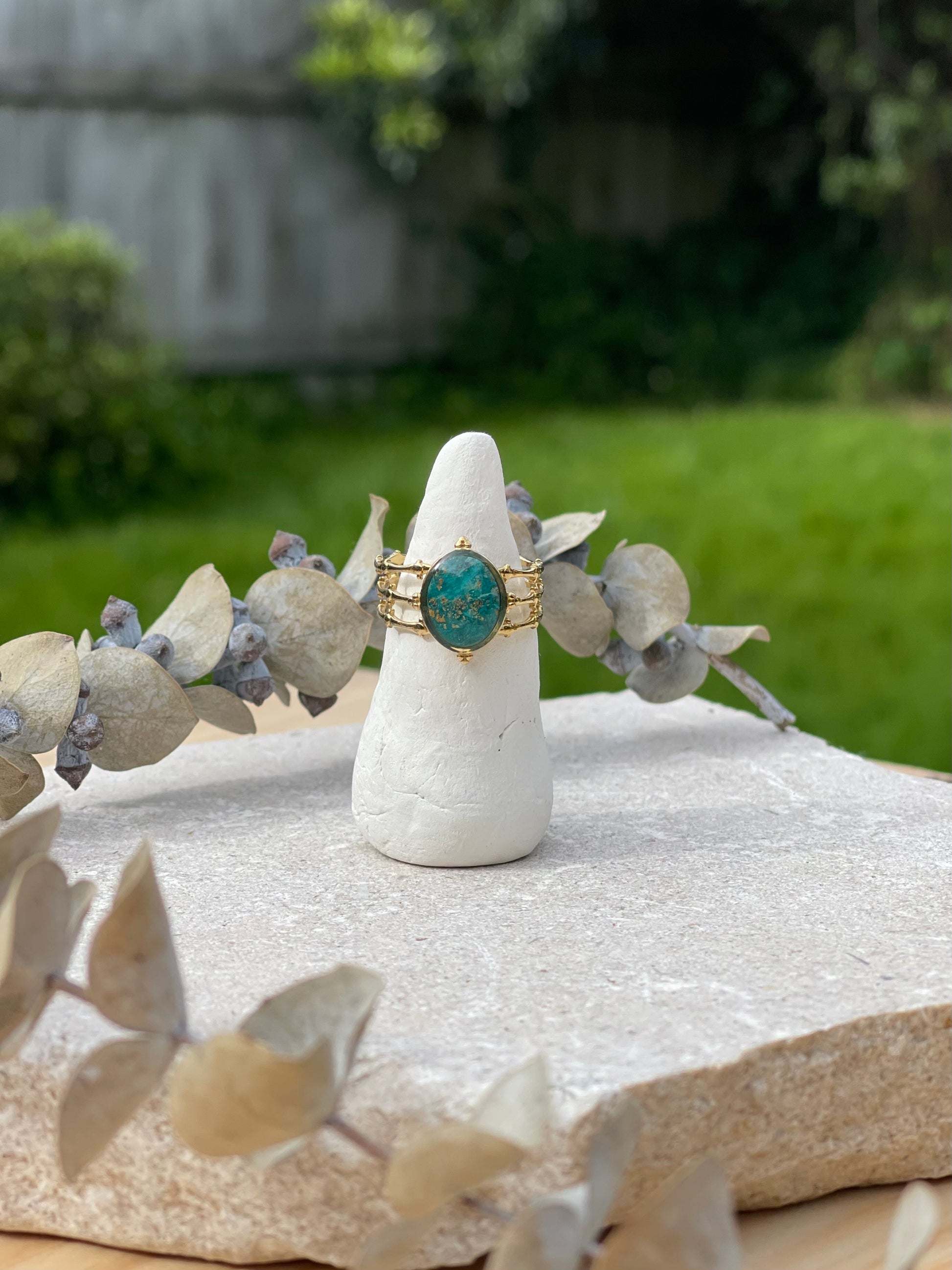 Stainless steel adjustable ring, blue/green colours with golden leaf, gem effect, topped by resin.