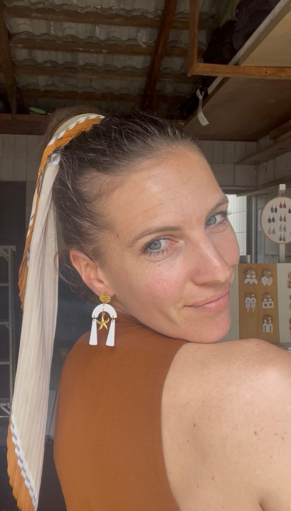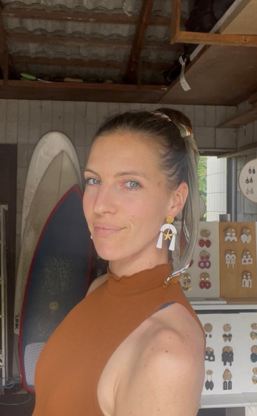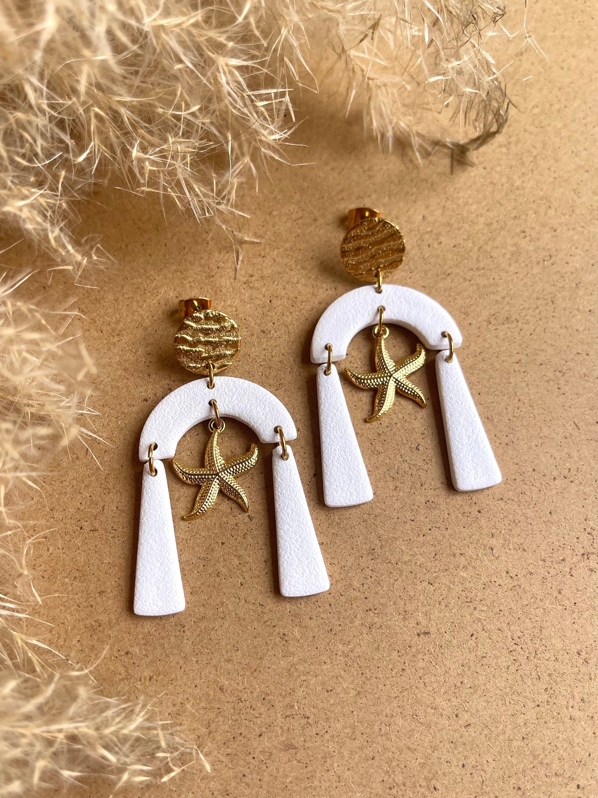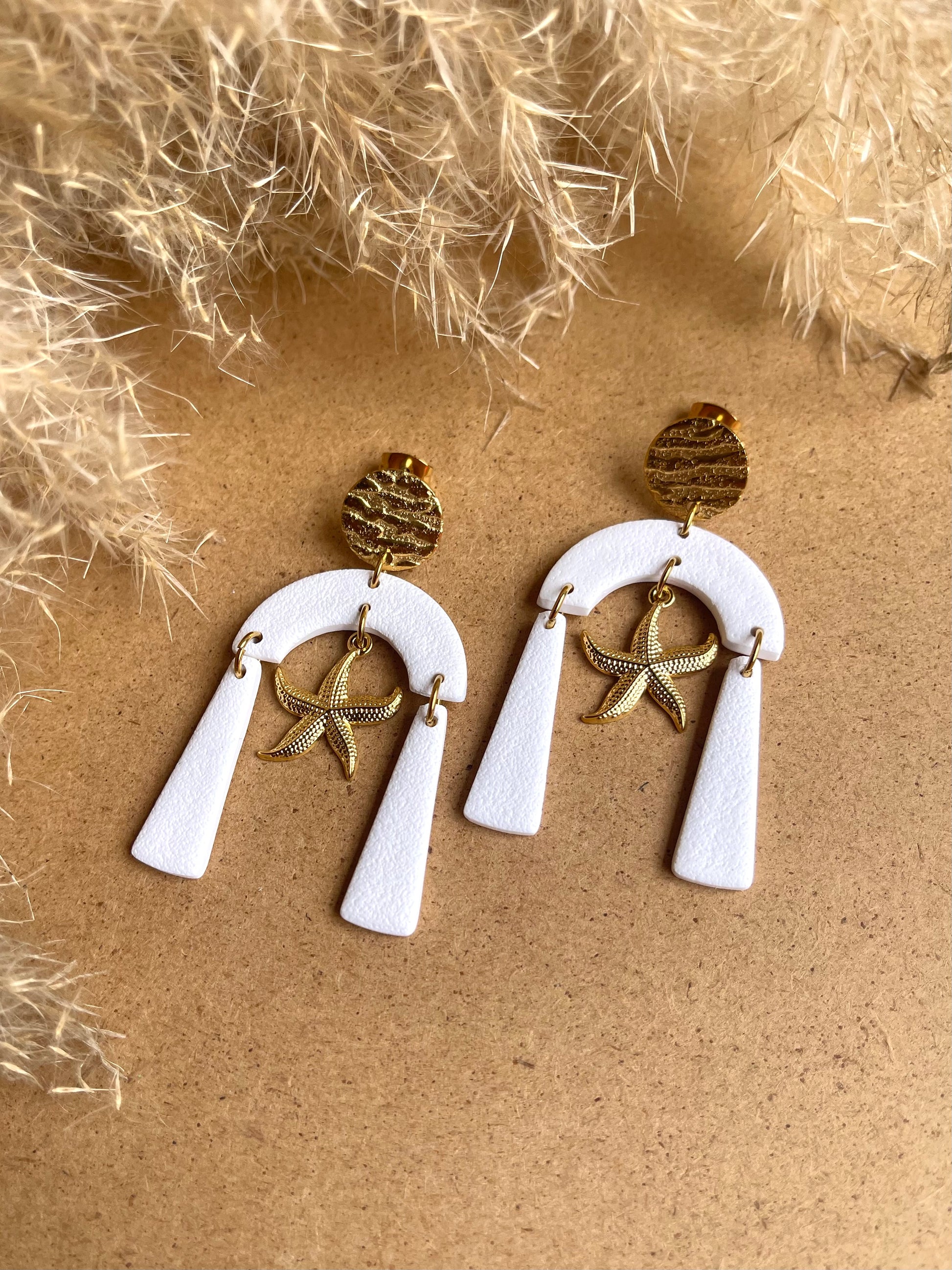 Stainless steel seashells starfish, in a long white dangle pair of extremely light earrings.